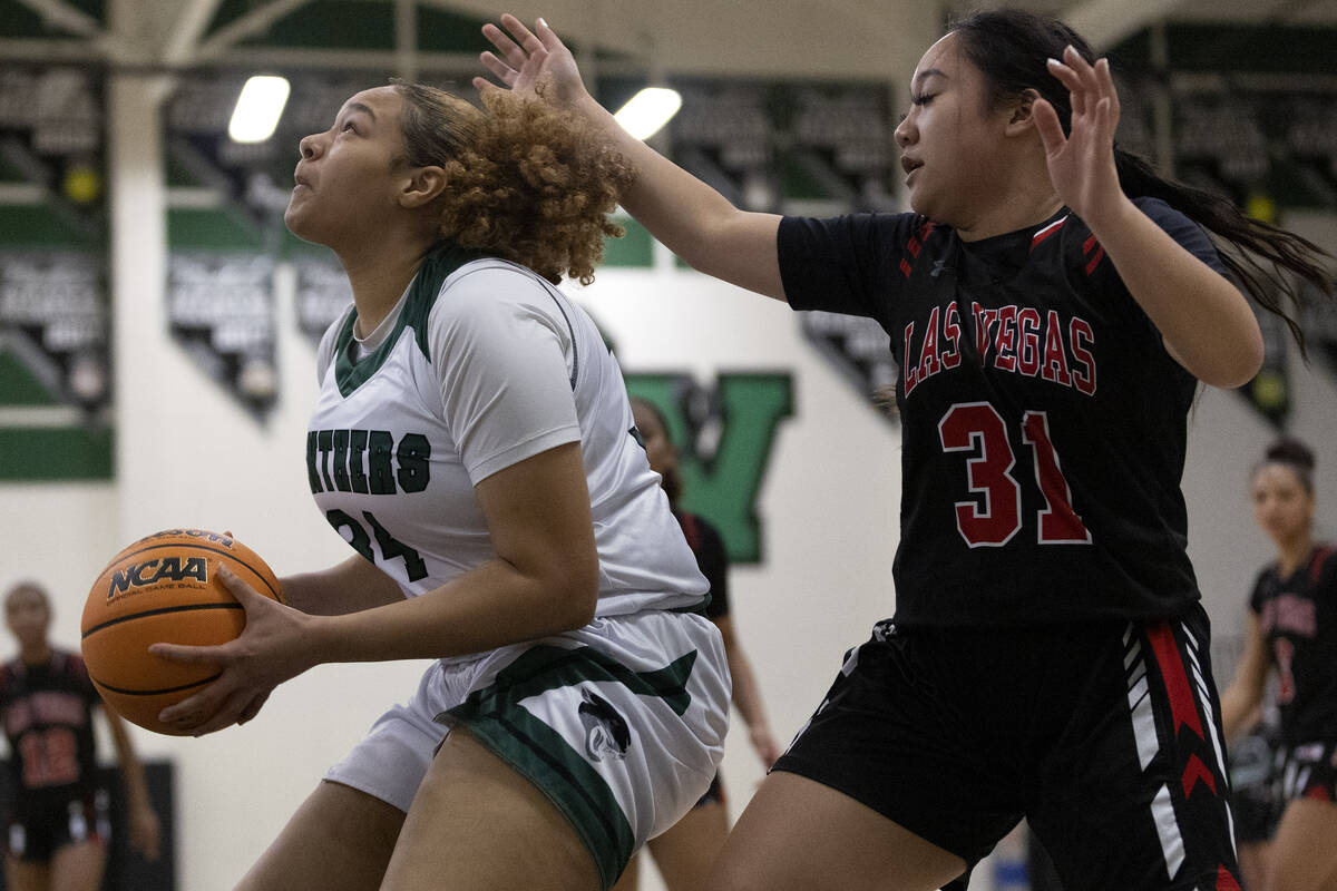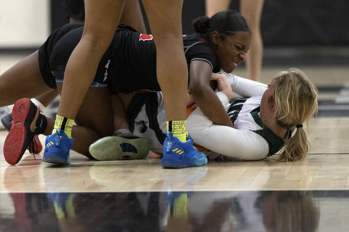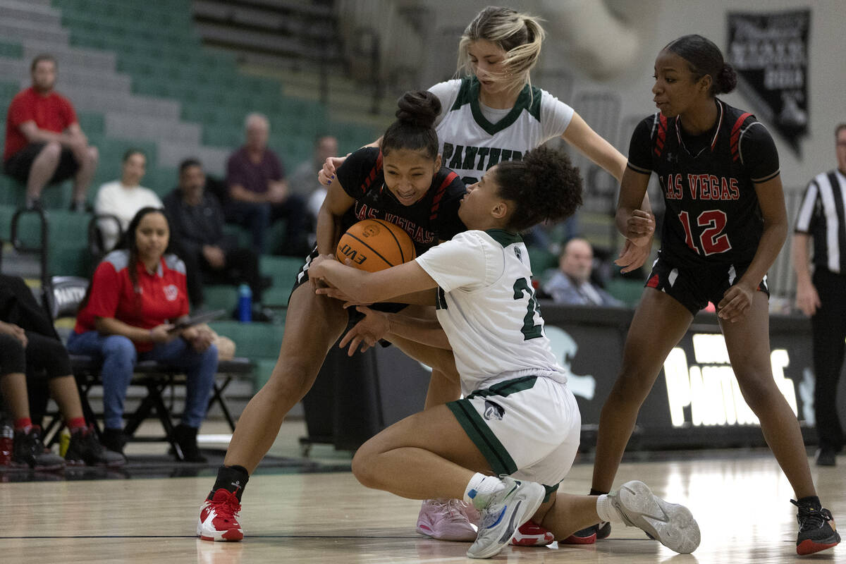 Las Vegas’ Jaidyn Savoy, top, fights for the ball with Palo Verde’s Halle McKnight during a girls high school basketball game at Palo Verde High School on Wednesday, Jan. 18, 2023, in Las Vegas. (Ellen Schmidt/Las Vegas Review-Journal) @ellenschmidttt