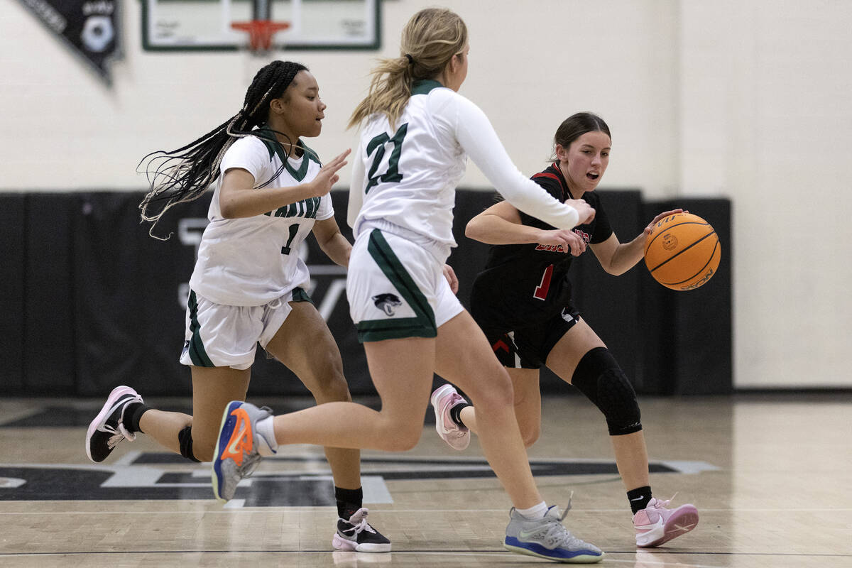 Palo Verde’s Reagan Nehls (1) looks to pass while Las Vegas’ Vernonie Newson (3) and Jaidyn Savoy, center, guard her during a girls high school basketball game at Palo Verde High School on Wednesday, Jan. 18, 2023, in Las Vegas. (Ellen Schmidt/Las Vegas Review-Journal) @ellenschmidttt