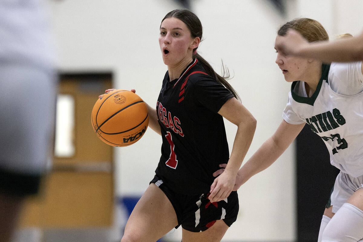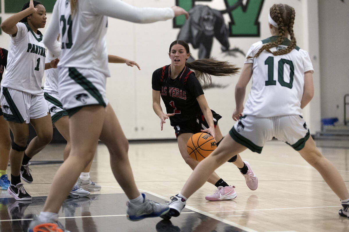 Las Vegas’ Layla Faught (1) looks for an opening through Palo Verde players including Breanna Scholz (23) and Reagan Nehls (10) during a girls high school basketball game at Palo Verde High School on Wednesday, Jan. 18, 2023, in Las Vegas. (Ellen Schmidt/Las Vegas Review-Journal) @ellenschmidttt
