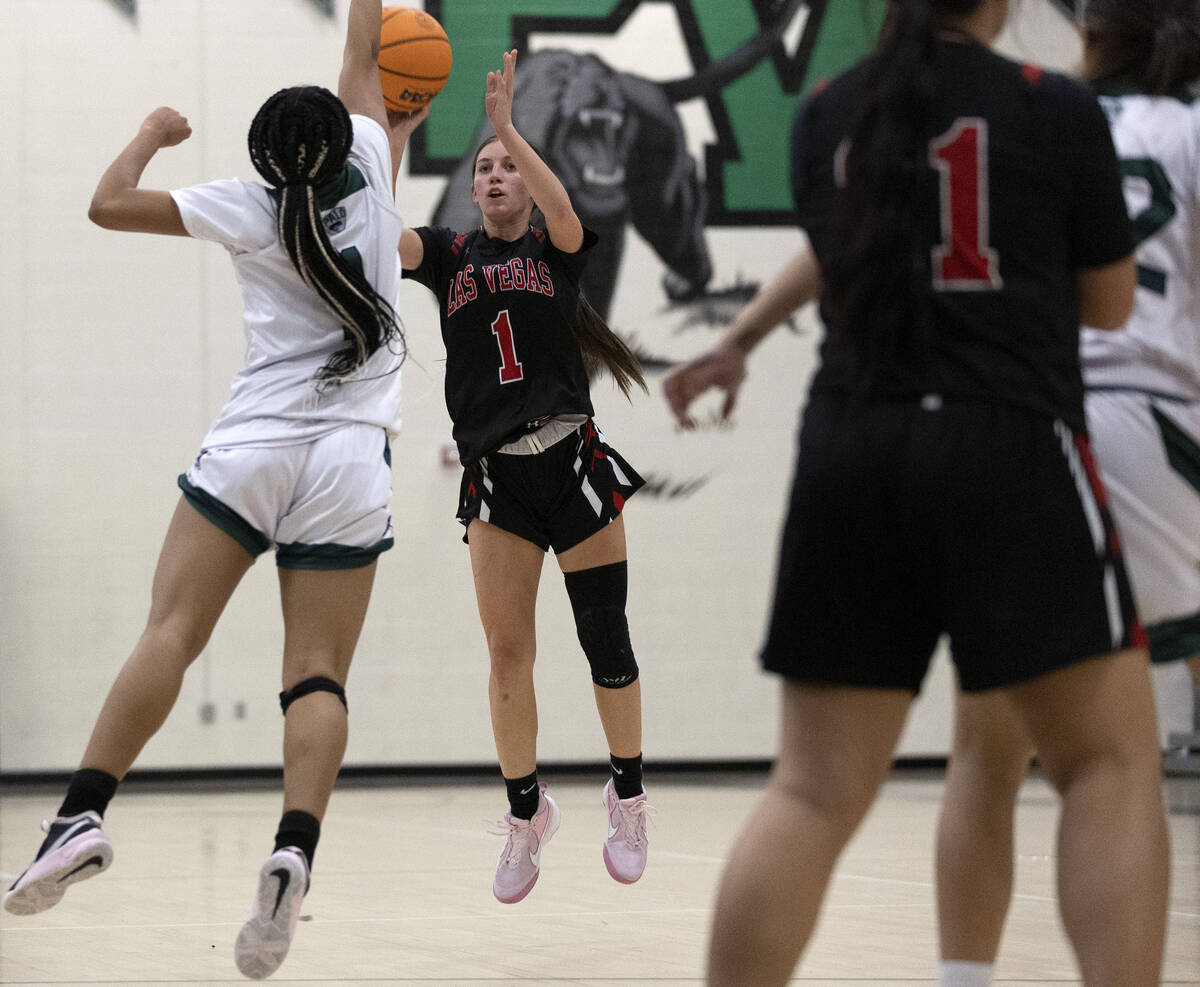 Las Vegas’ Layla Faught (1) shoots against Palo Verde’s Arriona Wright, left, during a girls high school basketball game at Palo Verde High School on Wednesday, Jan. 18, 2023, in Las Vegas. (Ellen Schmidt/Las Vegas Review-Journal) @ellenschmidttt