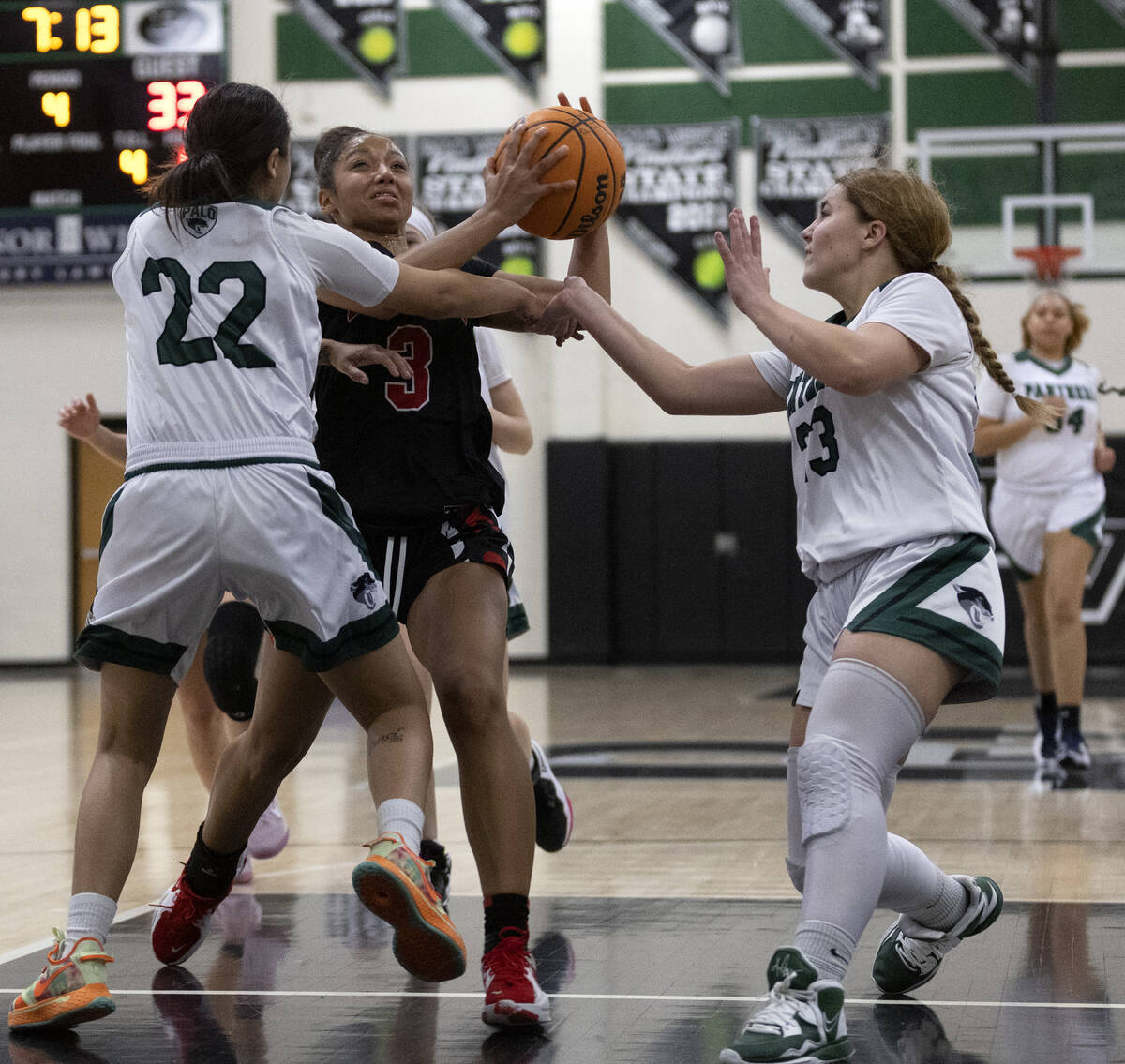 Las Vegas’ Vernonie Newson, center left, fights for the ball with Palo Verde’s Alana Conner (24) and Olivia Aznarez, back center, during a girls high school basketball game at Palo Verde High School on Wednesday, Jan. 18, 2023, in Las Vegas. At right is Las Vegas’ Jaidyn Savoy (12). (Ellen Schmidt/Las Vegas Review-Journal) @ellenschmidttt