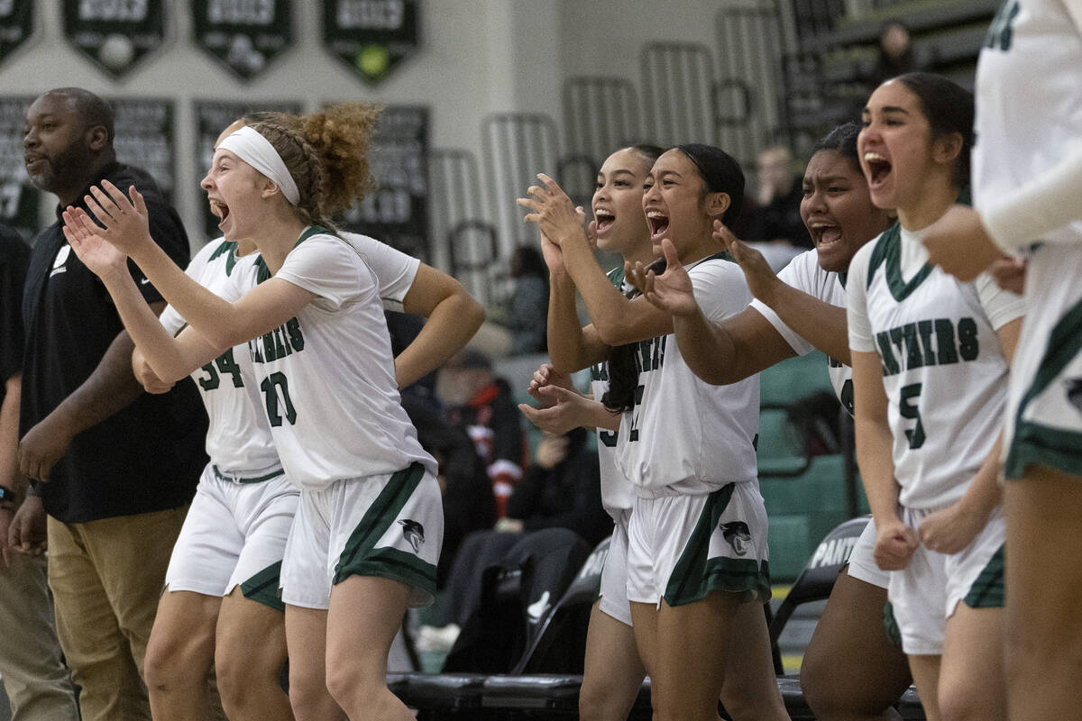 Palo Verde celebrates from the bench as their Halle McKnight secured their win with a free throw in the final second of a girls high school basketball game against Las Vegas at Palo Verde High School on Wednesday, Jan. 18, 2023, in Las Vegas. (Ellen Schmidt/Las Vegas Review-Journal) @ellenschmidttt