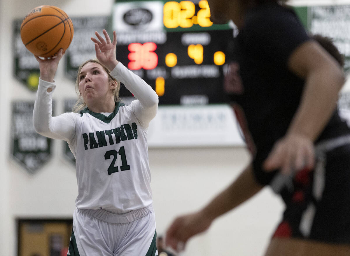 Palo Verde’s Halle McKnight (21) shoots the game-winning free throw during a girls high school basketball game against Las Vegas at Palo Verde High School on Wednesday, Jan. 18, 2023, in Las Vegas. (Ellen Schmidt/Las Vegas Review-Journal) @ellenschmidttt