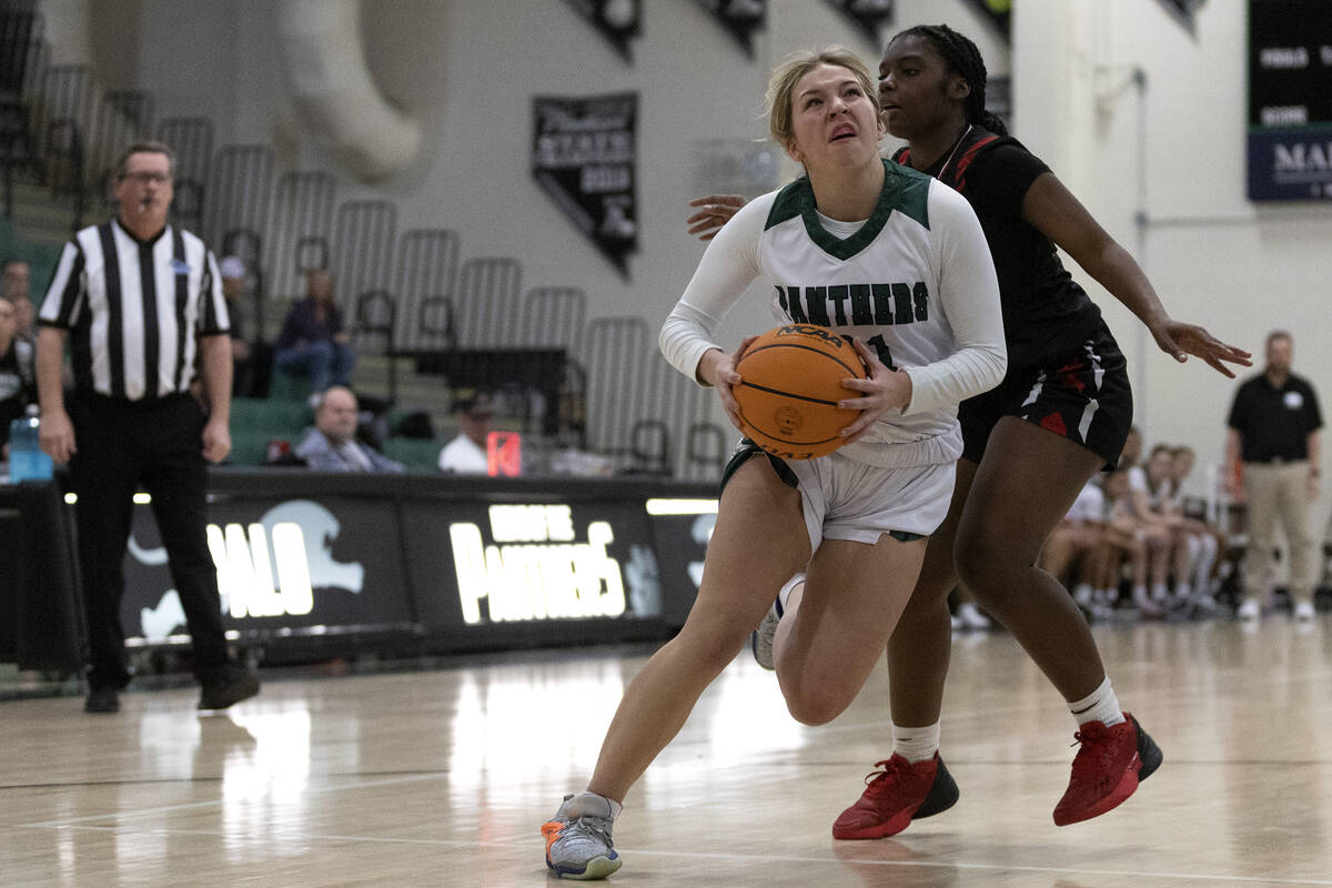 Palo Verde’s Halle McKnight, left, moves toward the hoop against Las Vegas’ Jordan Debois, right, during a girls high school basketball game at Palo Verde High School on Wednesday, Jan. 18, 2023, in Las Vegas. (Ellen Schmidt/Las Vegas Review-Journal) @ellenschmidttt