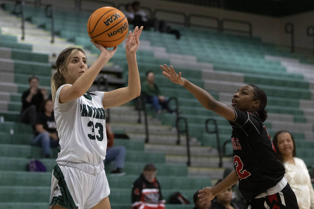 Palo Verde’s Olivia Aznarez (33) attempts a three-pointer against Las Vegas’ Jaidyn Savoy, right, during a girls high school basketball game at Palo Verde High School on Wednesday, Jan. 18, 2023, in Las Vegas. (Ellen Schmidt/Las Vegas Review-Journal) @ellenschmidttt