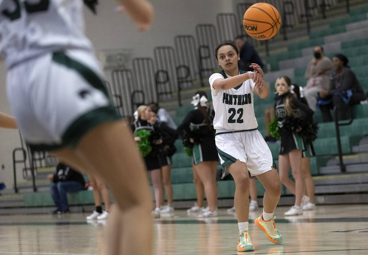 Palo Verde’s Sophia Rivera (22) passes to teammate Olivia Aznarez, obscured at left, during a girls high school basketball game against Las Vegas at Palo Verde High School on Wednesday, Jan. 18, 2023, in Las Vegas. (Ellen Schmidt/Las Vegas Review-Journal) @ellenschmidttt