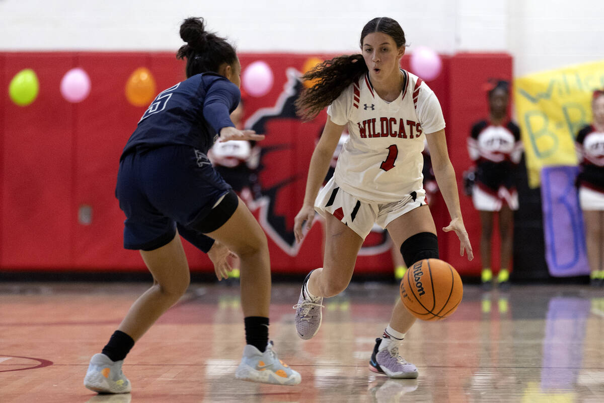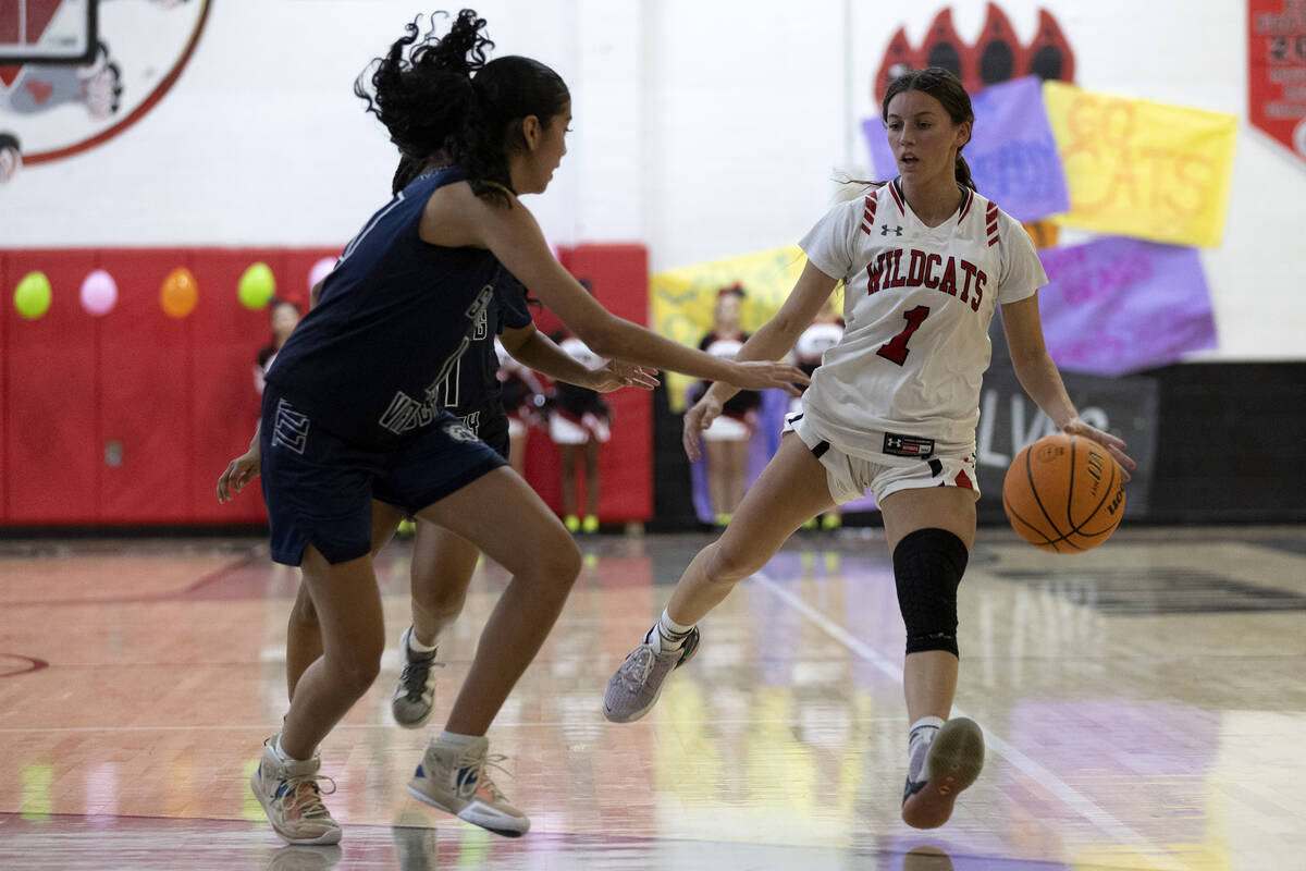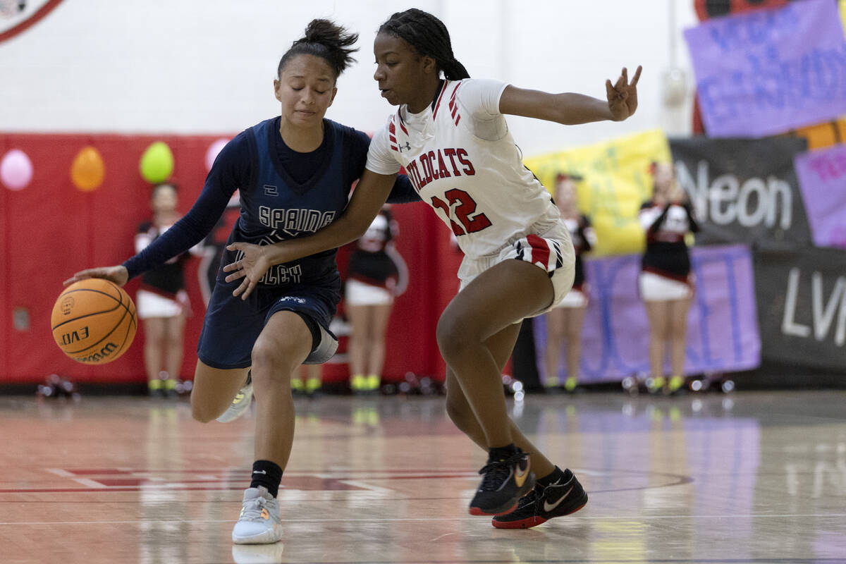Las Vegas’ Layla Faught (1) dribbles around Spring Valley’s Melanie Ortiz, left, during a girls high school basketball game at Las Vegas High School on Thursday, Dec. 1, 2022, in Las Vegas. (Ellen Schmidt/Las Vegas Review-Journal) @ellenschmidttt