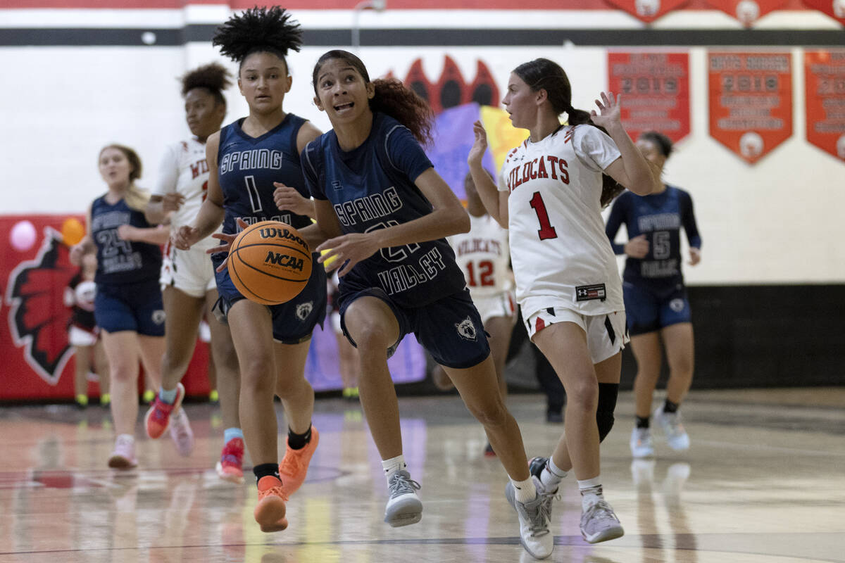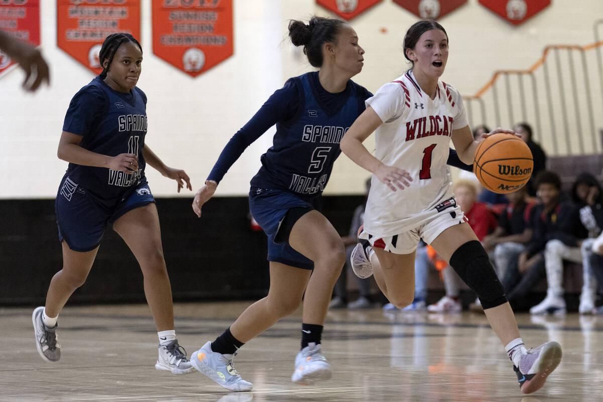 Las Vegas’ Layla Faught (1) dribbles around Spring Valley’s Gia McFadden (5) while Mi’yana Stephens (11) follows during a girls high school basketball game at Las Vegas High School on Thursday, Dec. 1, 2022, in Las Vegas. (Ellen Schmidt/Las Vegas Review-Journal) @ellenschmidttt