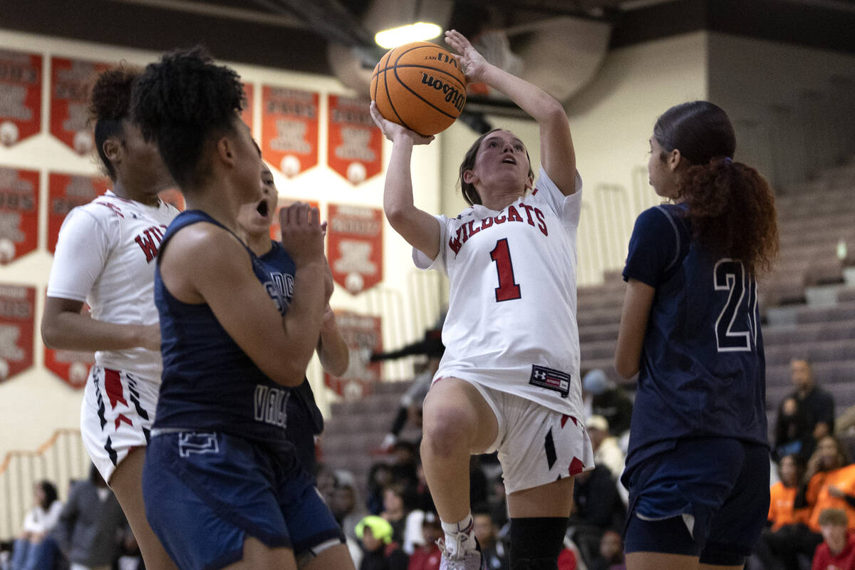 Las Vegas’ Layla Faught (1) shoots against Spring Valley’s Mia Ervin, left, and Charolette De Lisle, right, during a girls high school basketball game at Las Vegas High School on Thursday, Dec. 1, 2022, in Las Vegas. (Ellen Schmidt/Las Vegas Review-Journal) @ellenschmidttt