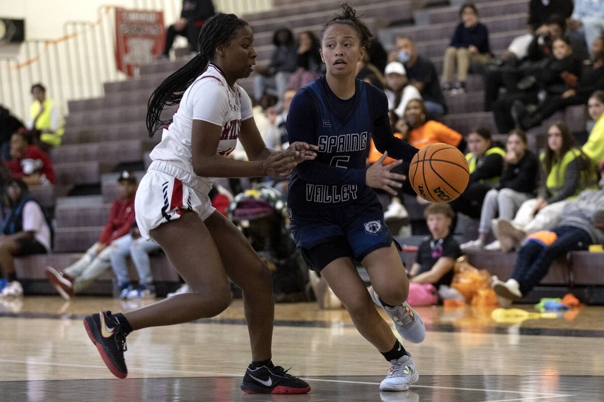 Spring Valley’s Gia McFadden (5) dribbles around Las Vegas’ Jaidyn Savoy, left, during a girls high school basketball game at Las Vegas High School on Thursday, Dec. 1, 2022, in Las Vegas. (Ellen Schmidt/Las Vegas Review-Journal) @ellenschmidttt