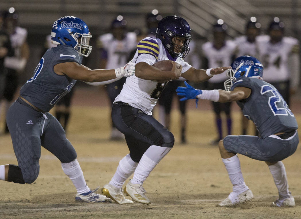 Durango’s Ryan Cabase (8) splits Green Valley defenders Christopher Lyons (10) and Anton Mazzulo (26) in the first quarter on Friday, Nov. 8, 2019, at Green Valley High School, in Las Vegas. (Benjamin Hager/Las Vegas Review-Journal) @benjaminhphoto