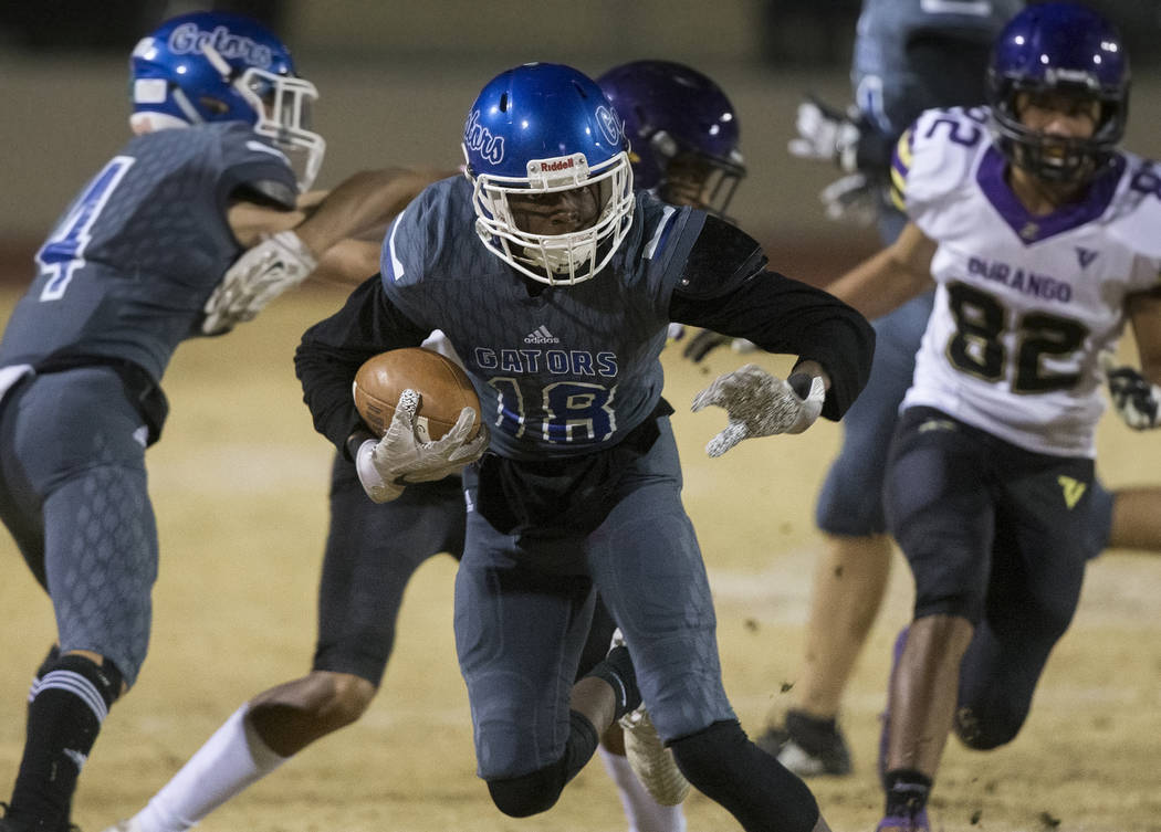 Green Valley’s Carlen Wallace (18) breaks free for a big run past Durango’s Tyson Guild (82) in the first quarter on Friday, Nov. 8, 2019, at Green Valley High School, in Las Vegas. (Benjamin Hager/Las Vegas Review-Journal) @benjaminhphoto