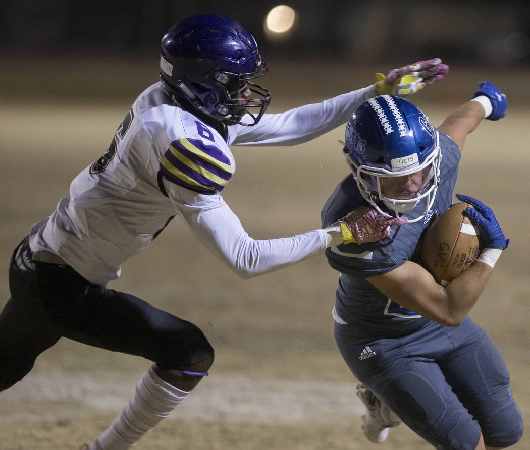 Green Valley’s Brady Clayton (4) makes a reception past Durango’s Michael Hayword (6) in the second quarter on Friday, Nov. 8, 2019, at Green Valley High School, in Las Vegas. (Benjamin Hager/Las Vegas Review-Journal) @benjaminhphoto