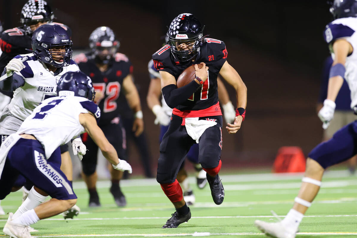 With Shadow Ridge clinging to a seven-point lead, Devon Woods recovered a botched handoff. With the help of a fourth-and-2 conversion, the Mustangs turned the takeaway into a two-possession lead on Maddyx Valenzuela’s 11-yard touchdown with 6:46 left.