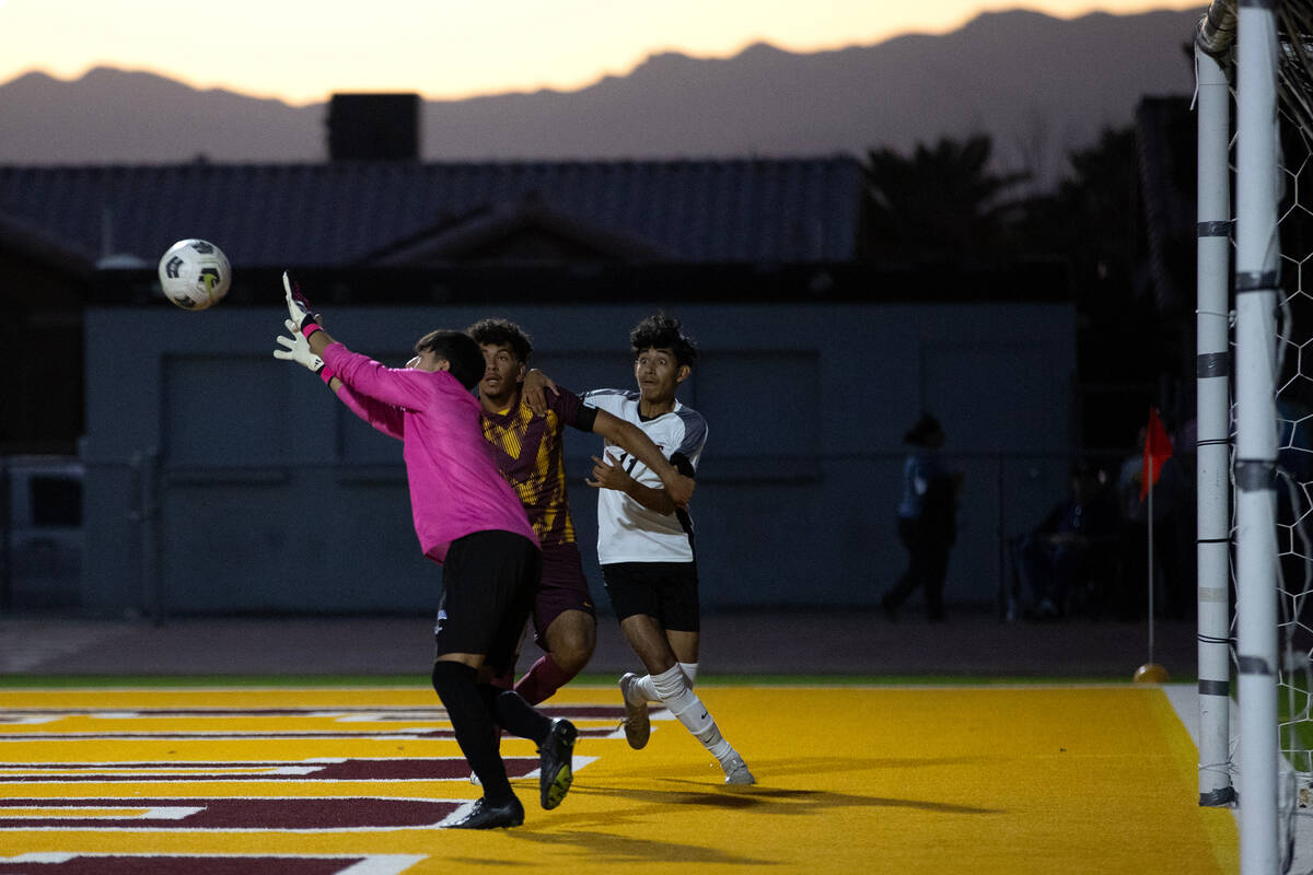 Las Vegas jumps to head away an Eldorado penalty kick during the second half of a boys high school soccer game at Eldorado High School on Tuesday, Oct. 24, 2023, in Las Vegas. (Ellen Schmidt/Las Vegas Review-Journal) @ellenschmidttt