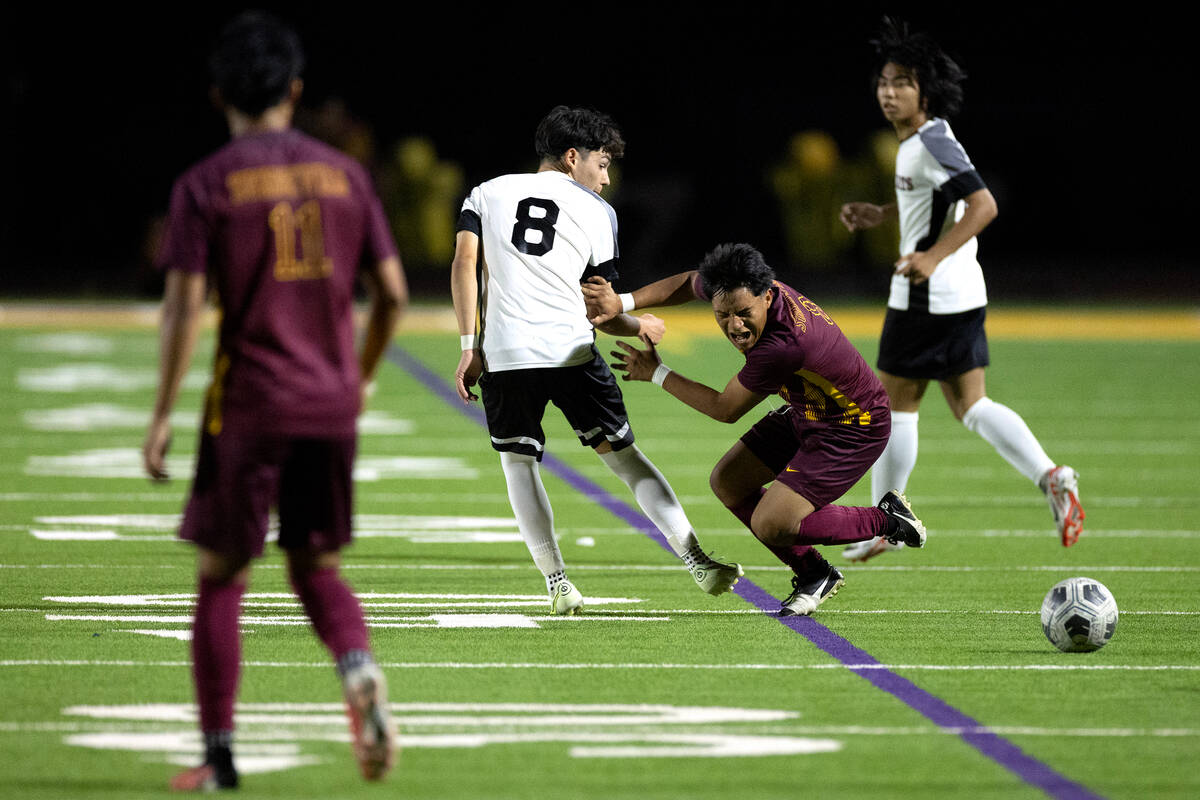 Eldorado midfielder Rogelio Berto (8) is tripped up by Las Vegas’ Oscar Sandoval (8) during the second half of a boys high school soccer game at Eldorado High School on Tuesday, Oct. 24, 2023, in Las Vegas. (Ellen Schmidt/Las Vegas Review-Journal) @ellenschmidttt