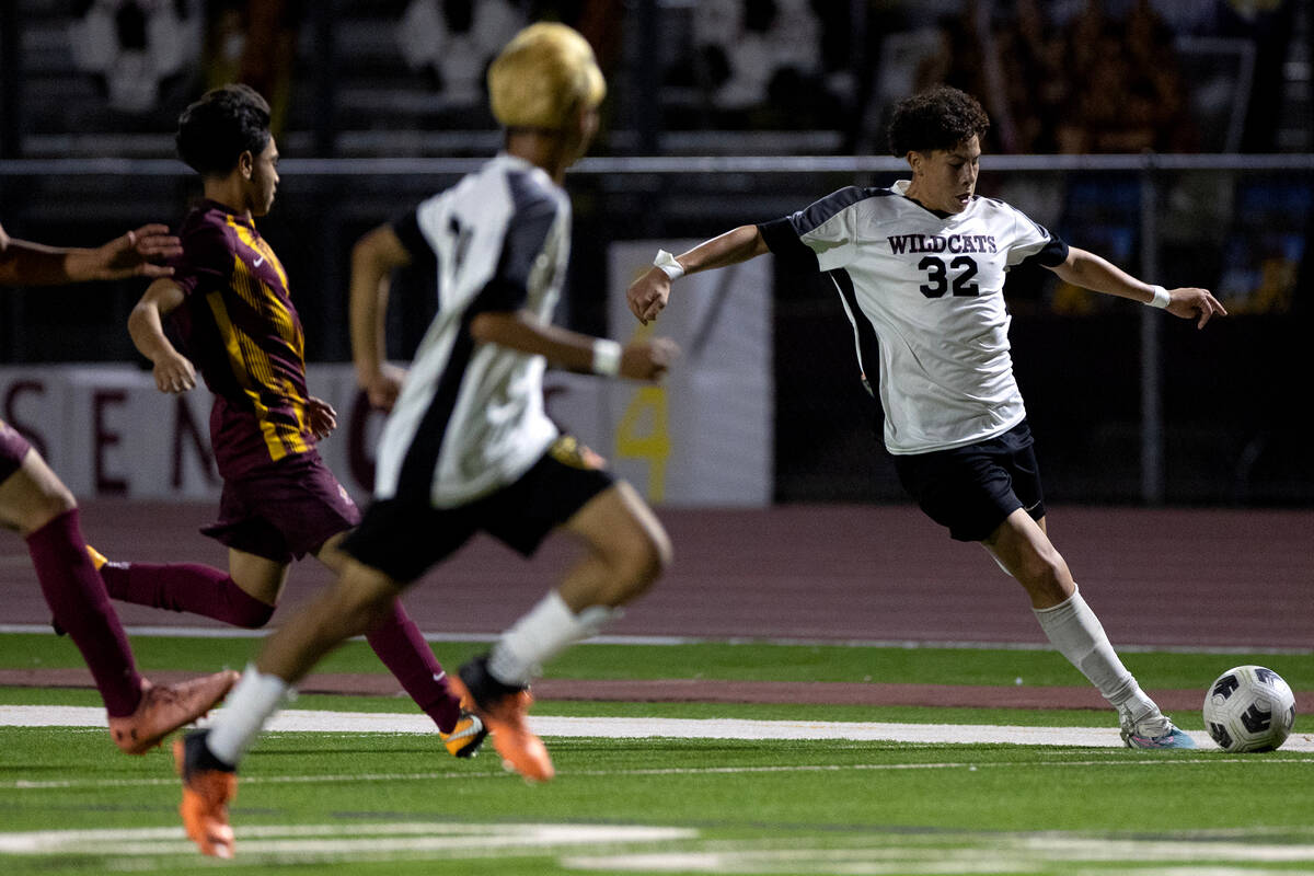 Las Vegas’ Bautista Silva (32) winds up to kick during the first half of a boys high school soccer game against Eldorado at Eldorado High School on Tuesday, Oct. 24, 2023, in Las Vegas. (Ellen Schmidt/Las Vegas Review-Journal) @ellenschmidttt