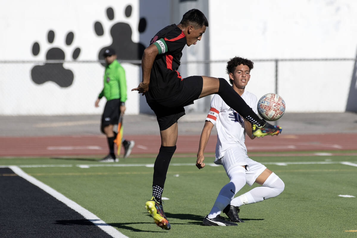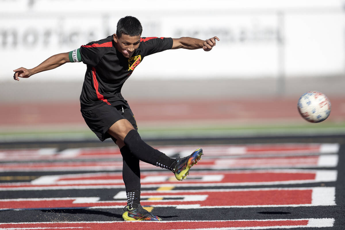 Las Vegas’ Ariel Lopez Trujillo (3) kicks the ball into play during a boys high school soccer game against Sunrise Mountain at Las Vegas High School on Wednesday, Sept. 6, 2023, in Las Vegas. (Ellen Schmidt/Las Vegas Review-Journal) @ellenschmidttt