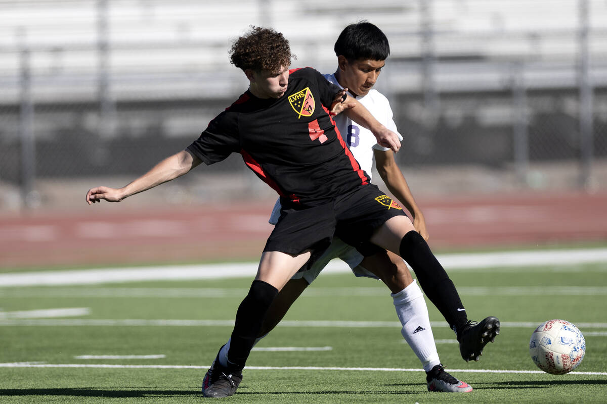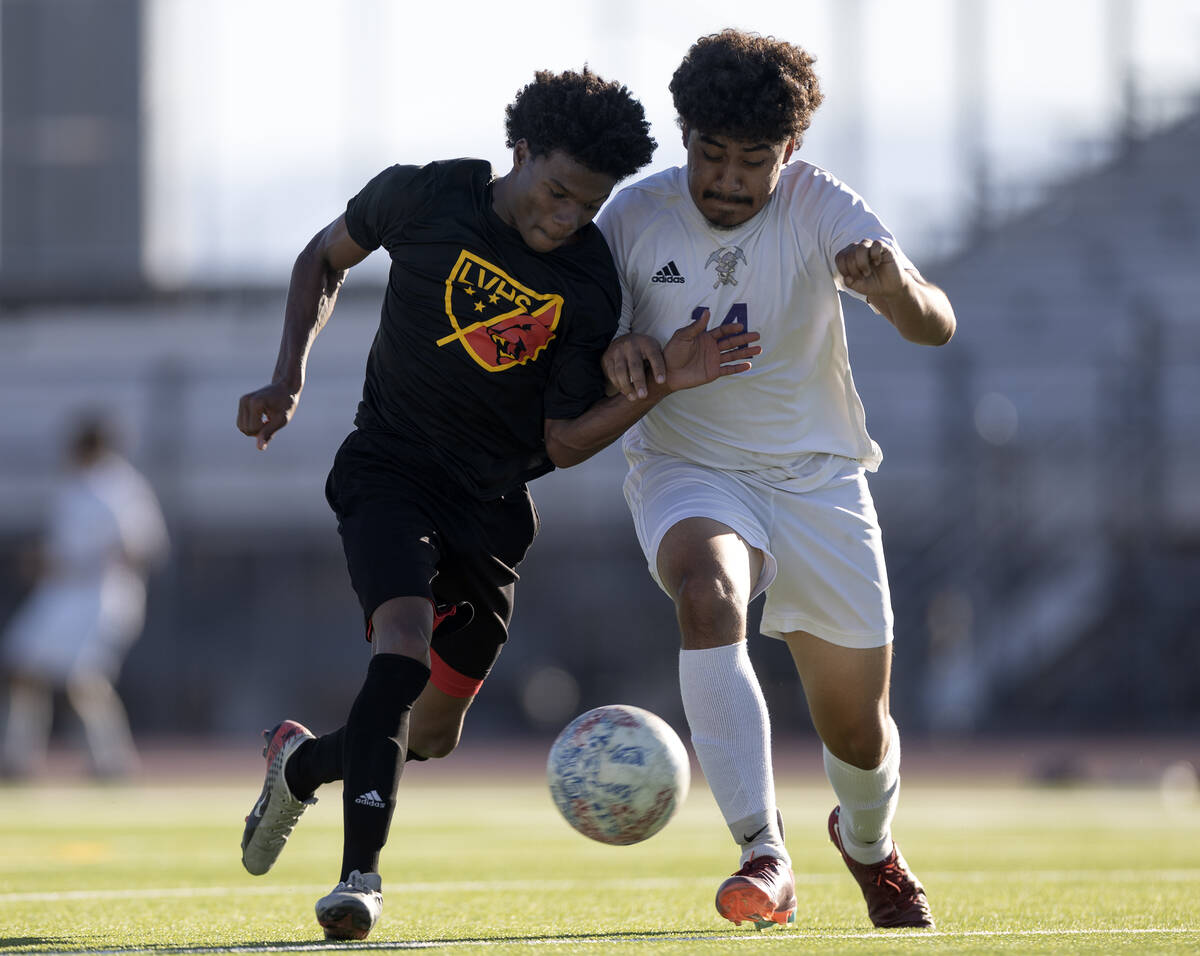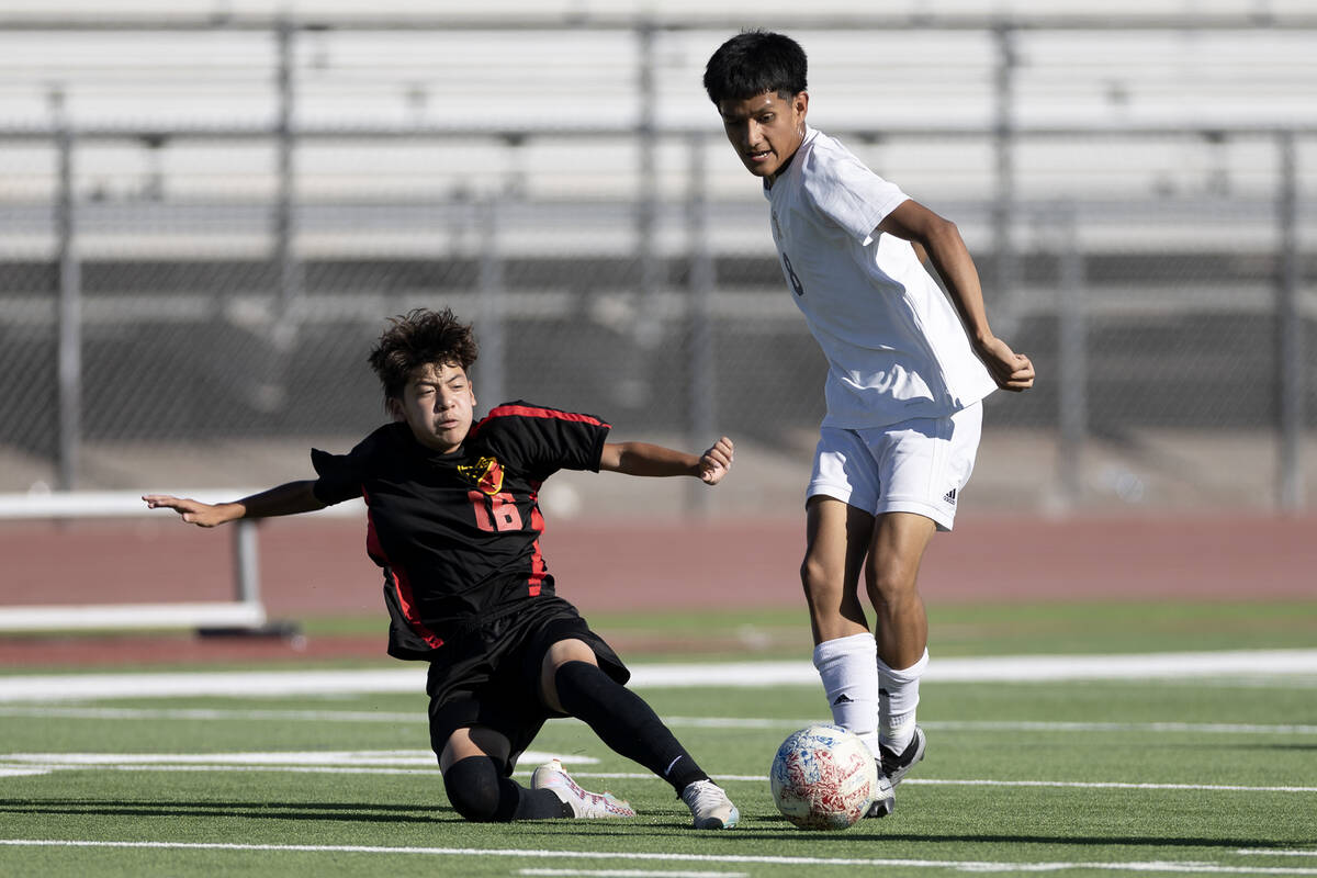 Sunrise Mountain’s Michael Umana (10) dribbles against Las Vegas’ Bautista Silva (32) during a boys high school soccer game at Las Vegas High School on Wednesday, Sept. 6, 2023, in Las Vegas. (Ellen Schmidt/Las Vegas Review-Journal) @ellenschmidttt
