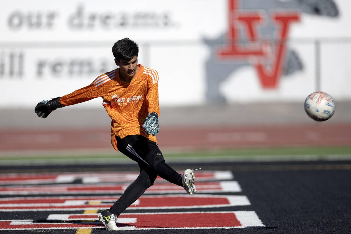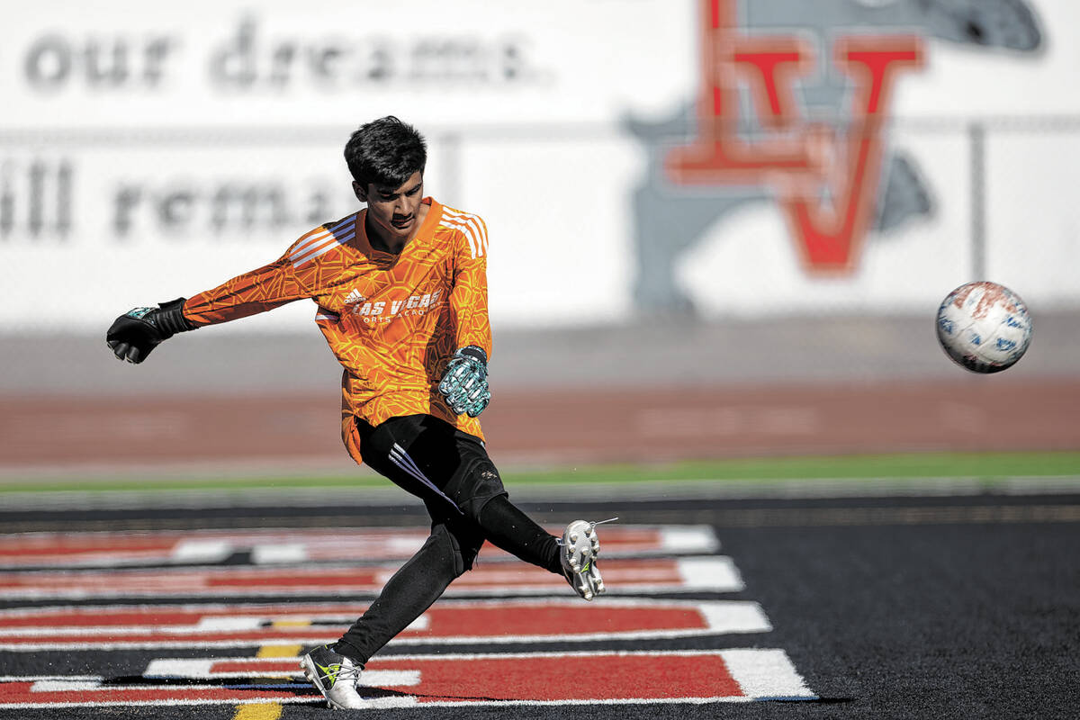 Las Vegas’ goalkeeper Byron Medina kicks the ball into play during a boys high school soccer game against Sunrise Mountain at Las Vegas High School on Wednesday, Sept. 6, 2023, in Las Vegas. (Ellen Schmidt/Las Vegas Review-Journal) @ellenschmidttt