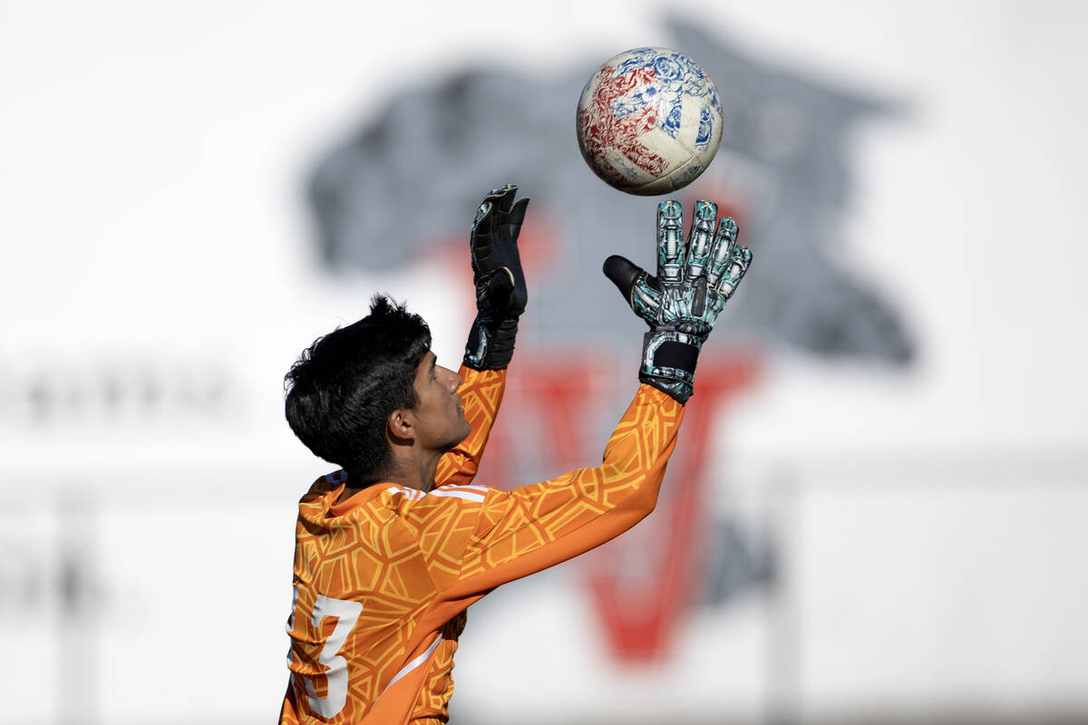 Las Vegas’ goalkeeper Byron Medina saves the ball on a Sunrise Mountain attempted goal during a boys high school soccer game at Las Vegas High School on Wednesday, Sept. 6, 2023, in Las Vegas. (Ellen Schmidt/Las Vegas Review-Journal) @ellenschmidttt