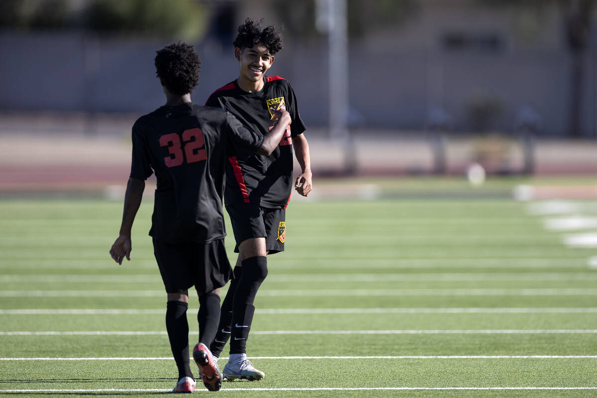 Las Vegas’ Jordan Brown (32) celebrates his goal with teammate Lex Madrigal (42) during a boys high school soccer game at Las Vegas High School on Wednesday, Sept. 6, 2023, in Las Vegas. (Ellen Schmidt/Las Vegas Review-Journal) @ellenschmidttt