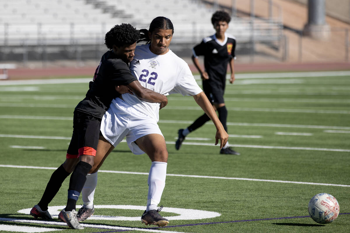 Las Vegas’ Jordan Brown (32) grabs hold of Sunrise Mountain’s German Alvarado Parra (22) while they compete for the ball during a boys high school soccer game at Las Vegas High School on Wednesday, Sept. 6, 2023, in Las Vegas. (Ellen Schmidt/Las Vegas Review-Journal) @ellenschmidttt