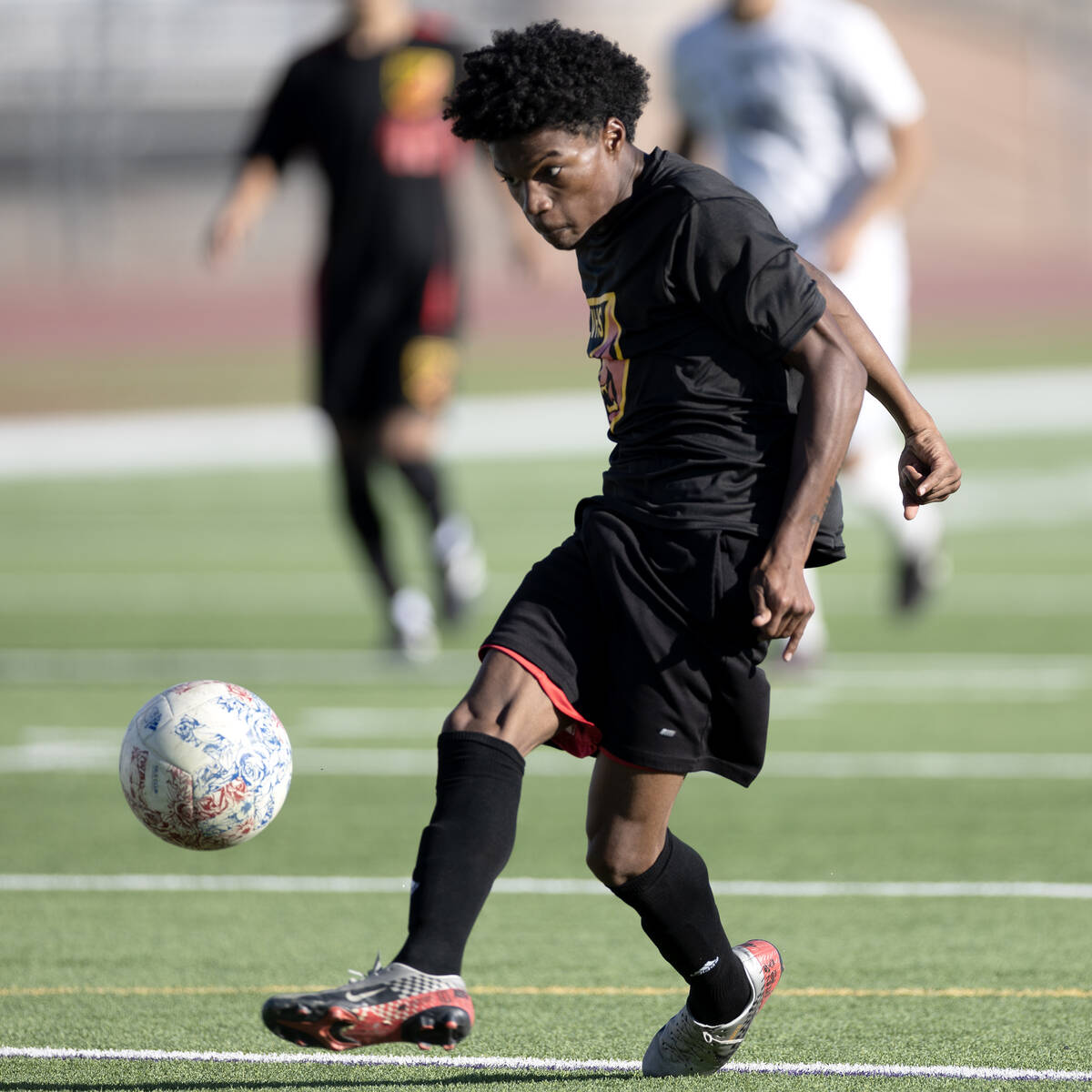 Las Vegas’ Jordan Brown (32) kicks before scoring a goal during a boys high school soccer game against Sunrise Mountain at Las Vegas High School on Wednesday, Sept. 6, 2023, in Las Vegas. (Ellen Schmidt/Las Vegas Review-Journal) @ellenschmidttt