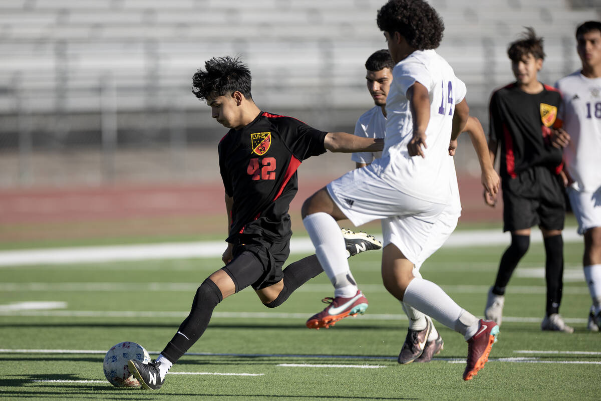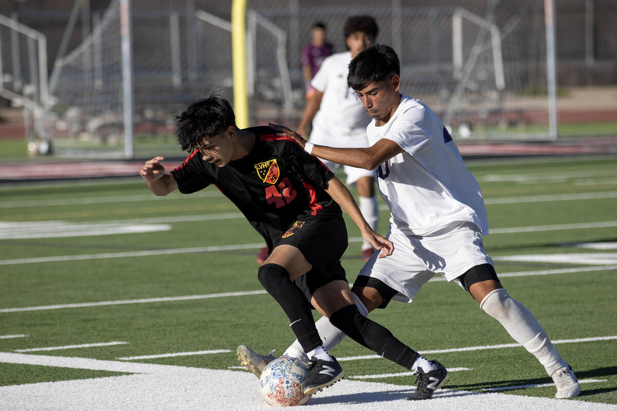 Las Vegas’ Lex Madrigal (42) attempts a goal while Sunrise Mountain’s Edgar Ceron Rodriguez (14) defends during a boys high school soccer game at Las Vegas High School on Wednesday, Sept. 6, 2023, in Las Vegas. (Ellen Schmidt/Las Vegas Review-Journal) @ellenschmidttt