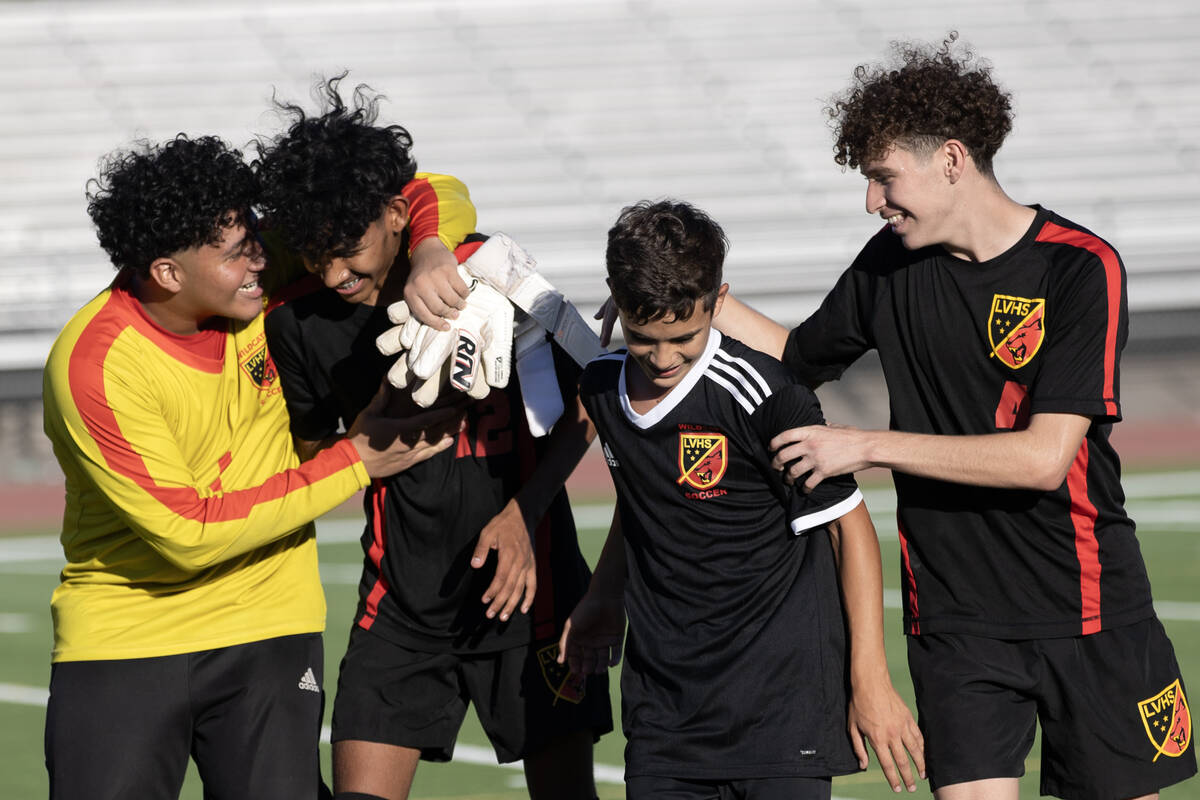 Las Vegas players celebrate their win in a boys high school soccer game against Sunrise Mountain at Las Vegas High School on Wednesday, Sept. 6, 2023, in Las Vegas. (Ellen Schmidt/Las Vegas Review-Journal) @ellenschmidttt