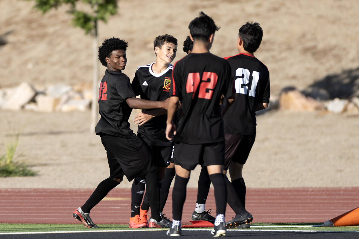 Las Vegas rallies around Las Vegas’ Bautista Silva, second from left, after he scored a goal during a boys high school soccer game against Sunrise Mountain at Las Vegas High School on Wednesday, Sept. 6, 2023, in Las Vegas. (Ellen Schmidt/Las Vegas Review-Journal) @ellenschmidttt
