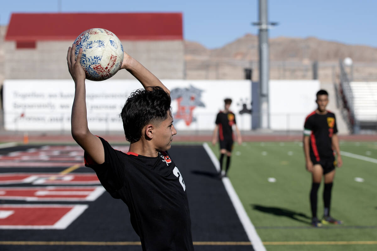 Las Vegas’ Valentin Mendoza (21) throws in during a boys high school soccer game against Sunrise Mountain at Las Vegas High School on Wednesday, Sept. 6, 2023, in Las Vegas. (Ellen Schmidt/Las Vegas Review-Journal) @ellenschmidttt