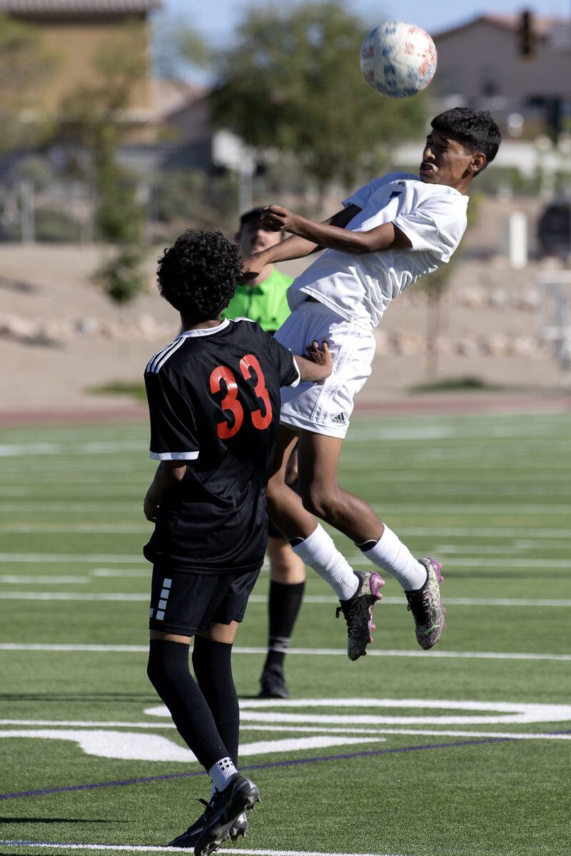 Sunrise Mountain’s Jeremiah Espana-Avendano (7) jumps for a header over Las Vegas’ Giovanni Hernandez (33) during a boys high school soccer game at Las Vegas High School on Wednesday, Sept. 6, 2023, in Las Vegas. (Ellen Schmidt/Las Vegas Review-Journal) @ellenschmidttt