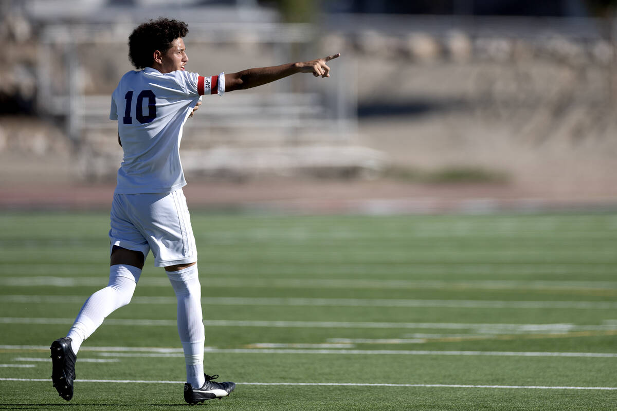 Sunrise Mountain’s Michael Umana (10) gestures to the stands after scoring a goal during a boys high school soccer game against Las Vegas’ at Las Vegas High School on Wednesday, Sept. 6, 2023, in Las Vegas. (Ellen Schmidt/Las Vegas Review-Journal) @ellenschmidttt
