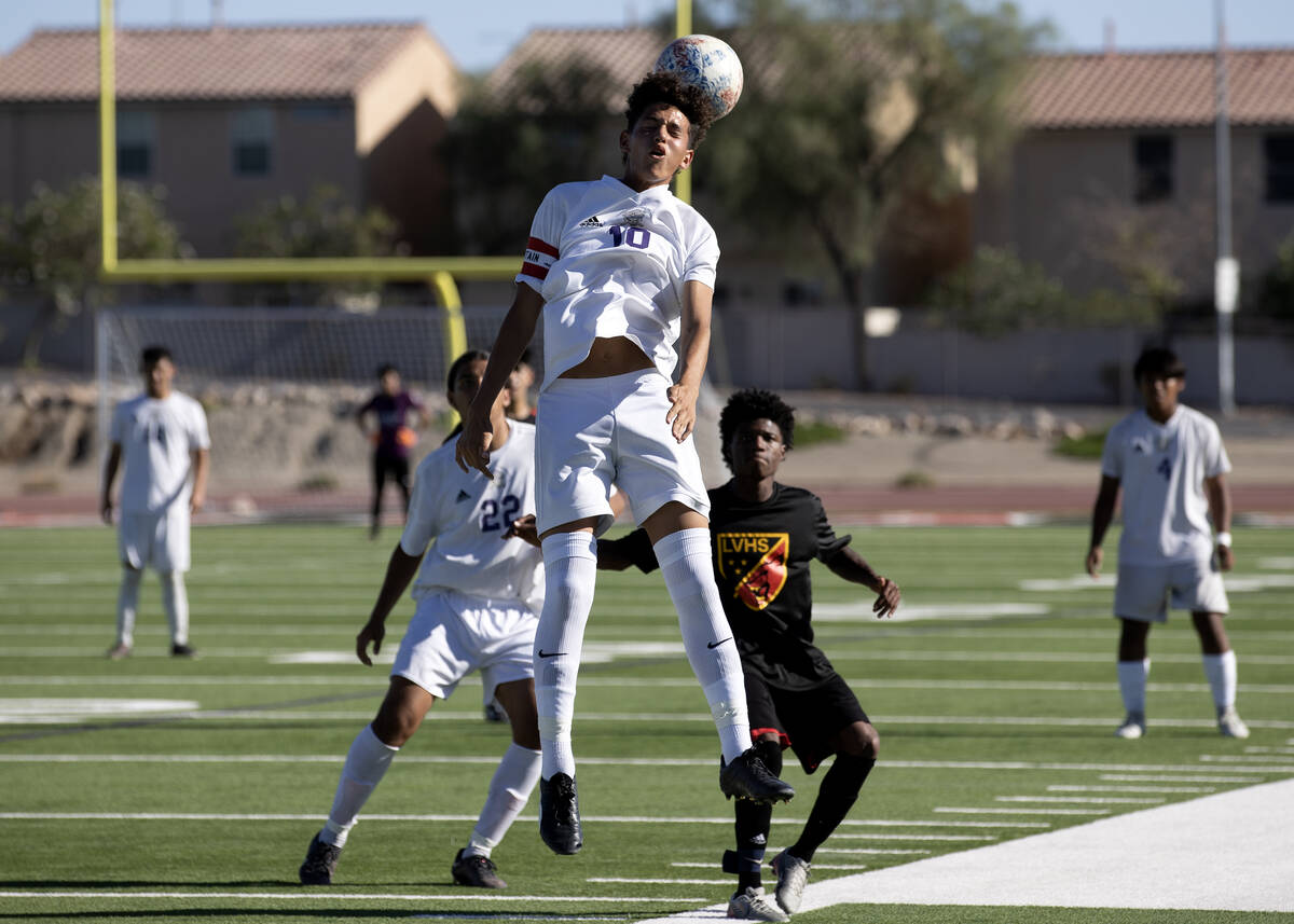 Sunrise Mountain’s Michael Umana (10) heads the ball during a boys high school soccer game against Sunrise Mountain at Las Vegas High School on Wednesday, Sept. 6, 2023, in Las Vegas. (Ellen Schmidt/Las Vegas Review-Journal) @ellenschmidttt