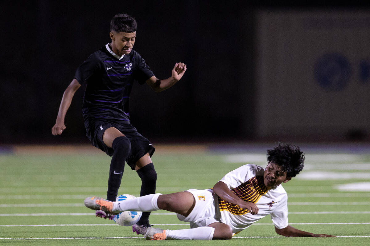 Eldorado’s Brandon Lopez, left, slide tackles Sunrise Mountain’s Jeremiah Espana-Avendano, left, during a high school soccer game at Sunrise Mountain High School on Tuesday, Aug. 22, 2023, in Las Vegas. (Ellen Schmidt/Las Vegas Review-Journal) @ellenschmidttt