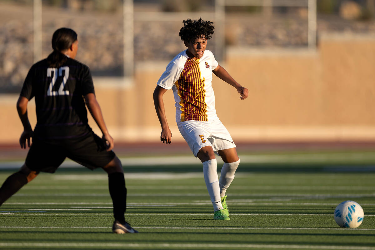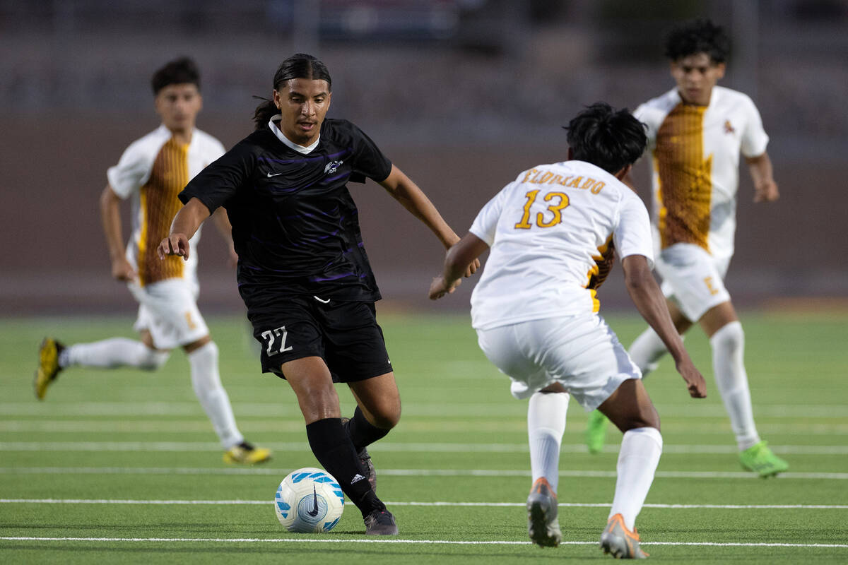 Eldorado’s Luis Martinez, center, passes around Sunrise Mountain’s German Alvarado Parra (22) during a high school soccer game at Sunrise Mountain High School on Tuesday, Aug. 22, 2023, in Las Vegas. (Ellen Schmidt/Las Vegas Review-Journal) @ellenschmidttt