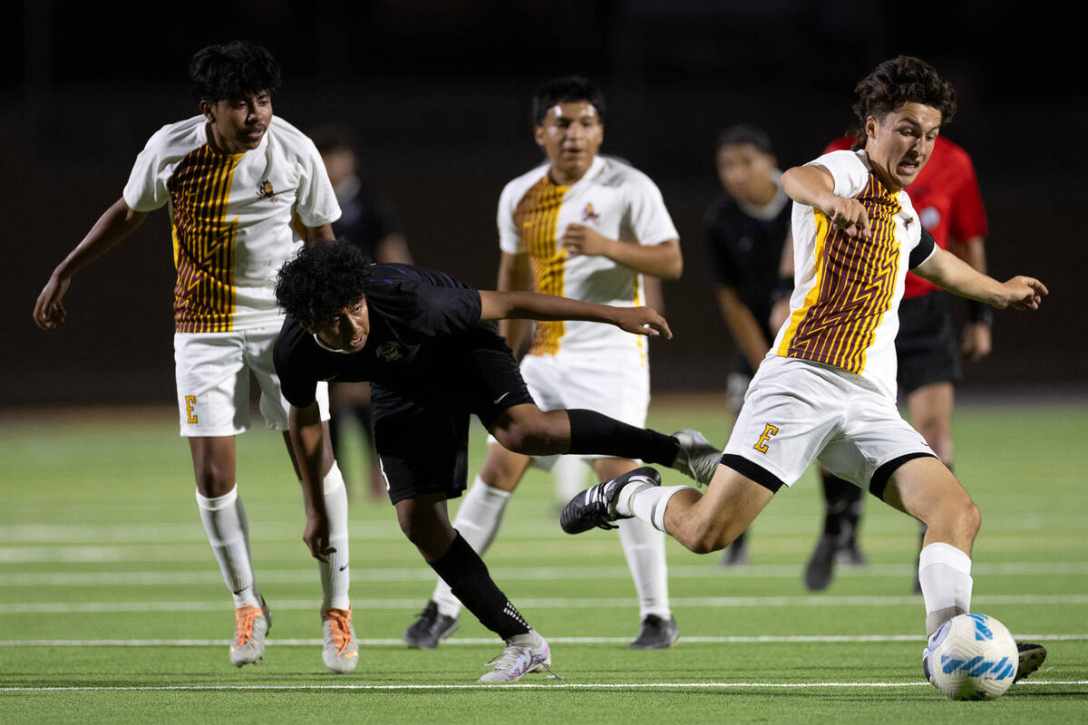 Eldorado’s Brandon Lopez, right, fights for possession of the ball after his teammate Jesse Garcia, left, fell to the field while Sunrise Mountain’s Omar Enciso (16) and Daniel Jimenez, second from right, defend during a high school soccer game at Sunrise Mountain High School on Tuesday, Aug. 22, 2023, in Las Vegas. (Ellen Schmidt/Las Vegas Review-Journal) @ellenschmidttt