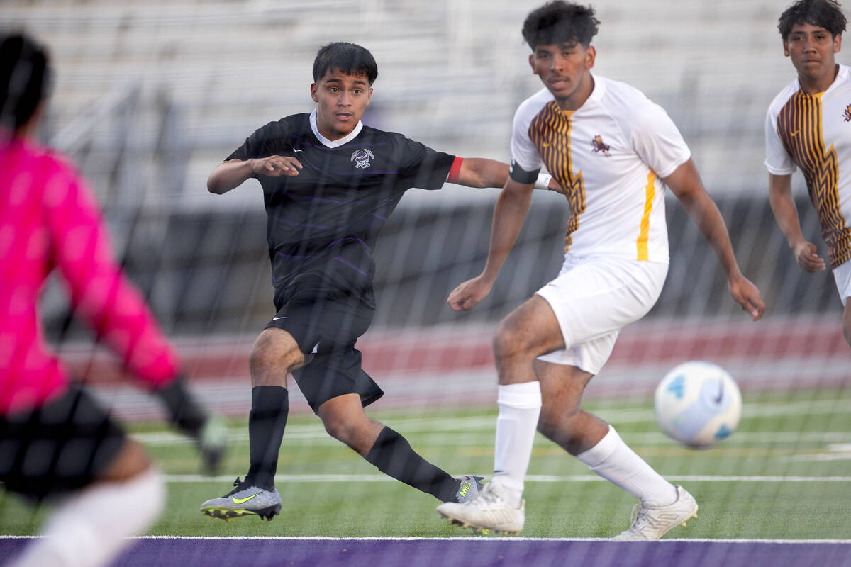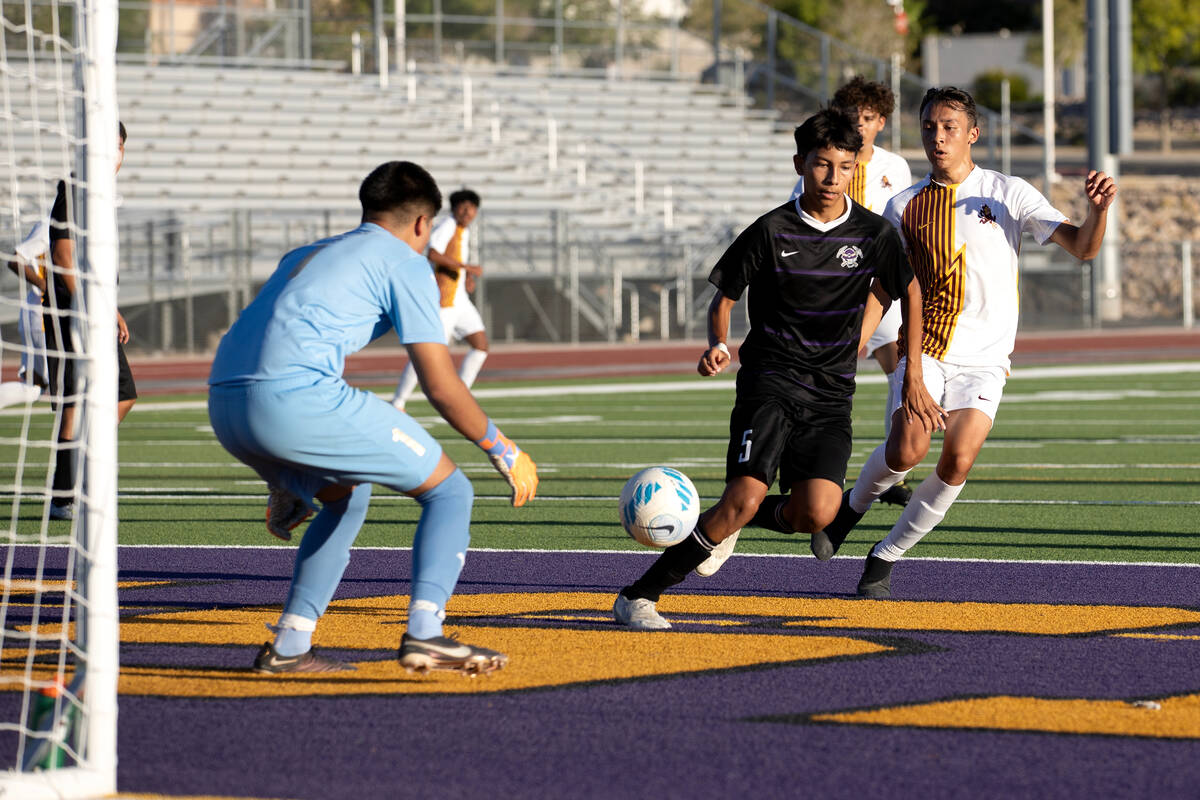 Sunrise Mountain’s Michael Pelcastre, center left, and Eldorado’s Jesse Garcia, center right, watch Pelcastre’s kick score a goal during a high school soccer game at Sunrise Mountain High School on Tuesday, Aug. 22, 2023, in Las Vegas. (Ellen Schmidt/Las Vegas Review-Journal) @ellenschmidttt