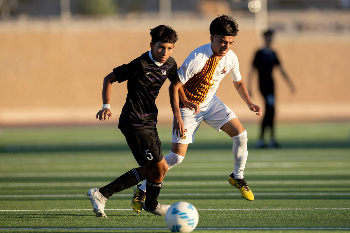 Sunrise Mountain’s Cristopher Munoz Martinez and Eldorado’s Daniel Murillo, right, run for the ball during a high school soccer game at Sunrise Mountain High School on Tuesday, Aug. 22, 2023, in Las Vegas. (Ellen Schmidt/Las Vegas Review-Journal) @ellenschmidttt