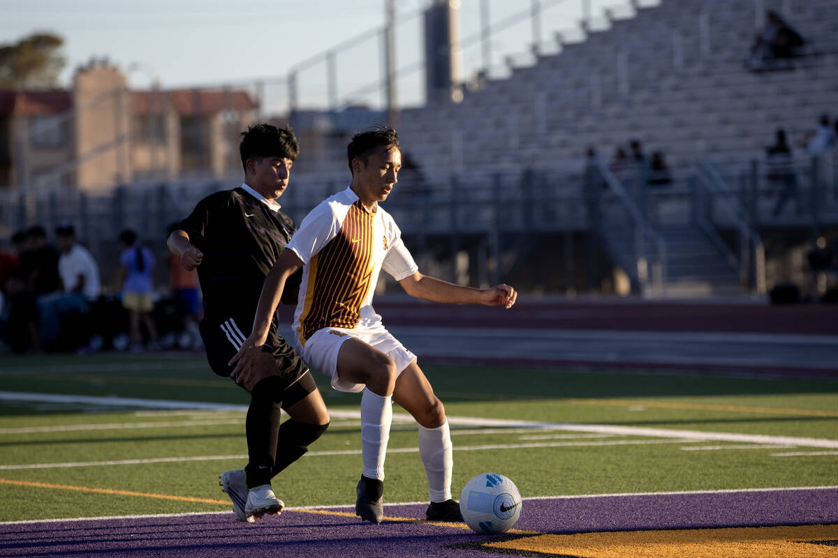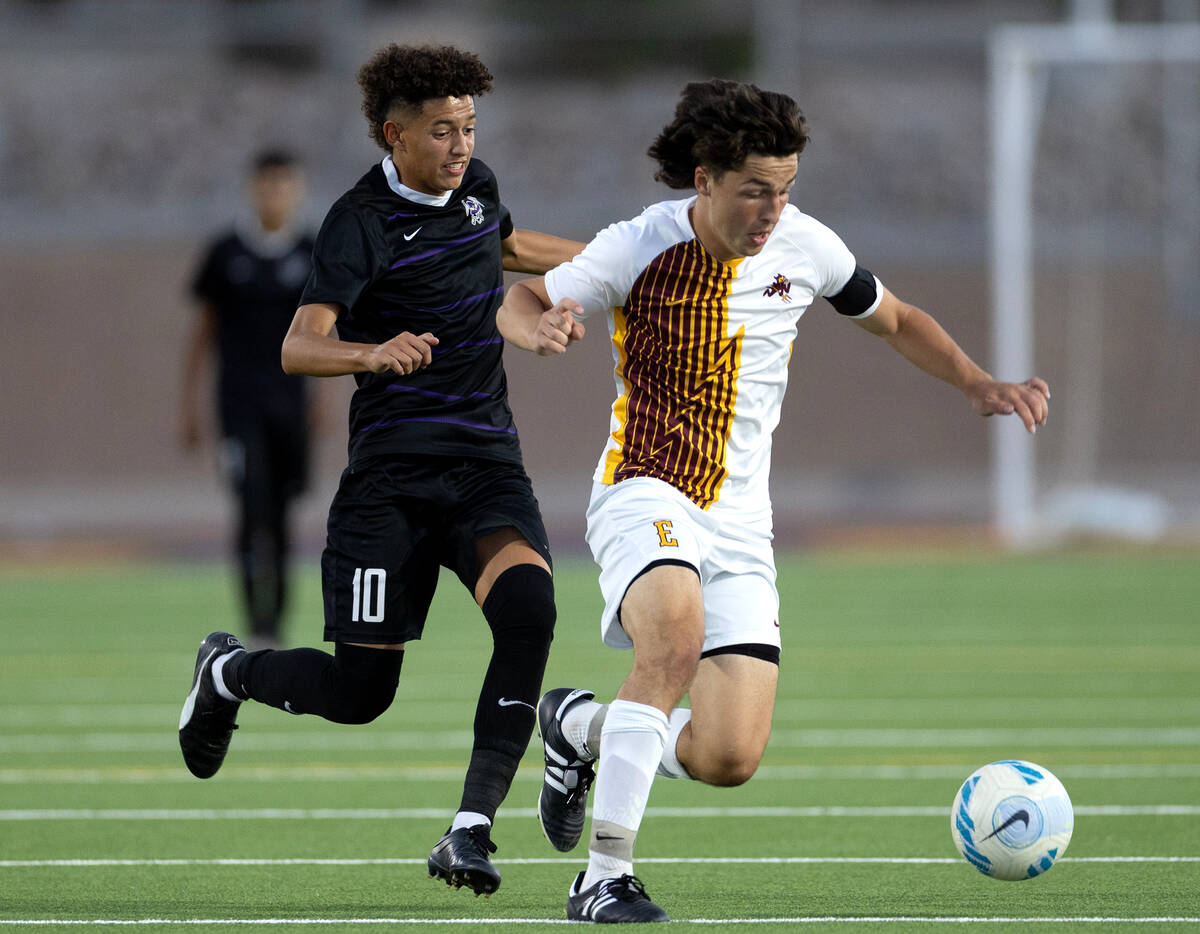 Sunrise Mountain’s Michael Umana (10) and Eldorado’s Luke Ostler, right, compete for the ball during a high school soccer game at Sunrise Mountain High School on Tuesday, Aug. 22, 2023, in Las Vegas. (Ellen Schmidt/Las Vegas Review-Journal) @ellenschmidttt