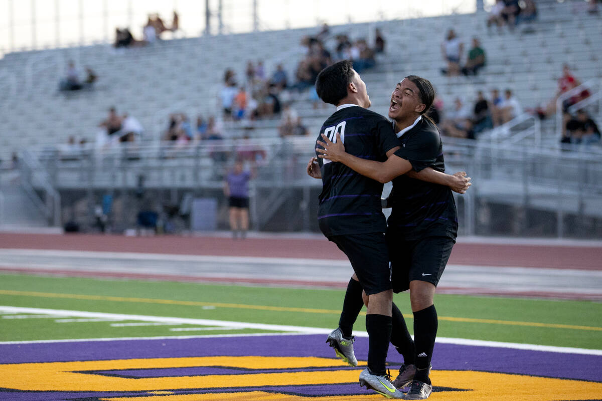 Sunrise Mountain’s Micheal Pelcastre (20) and German Alvarado Parra, center right, celebrate their goal during a high school soccer game against Eldorado at Sunrise Mountain High School on Tuesday, Aug. 22, 2023, in Las Vegas. (Ellen Schmidt/Las Vegas Review-Journal) @ellenschmidttt