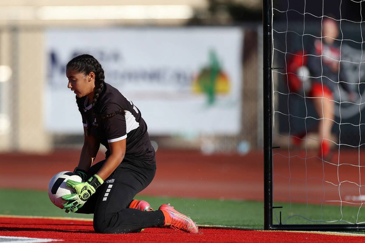 Arbor View’s Bebe Harris (99) makes a stop against Arbor View during the first half of a girl’s soccer game at Arbor View High School in Las Vegas, Tuesday, Oct. 12, 2021. (Erik Verduzco / Las Vegas Review-Journal) @Erik_Verduzco