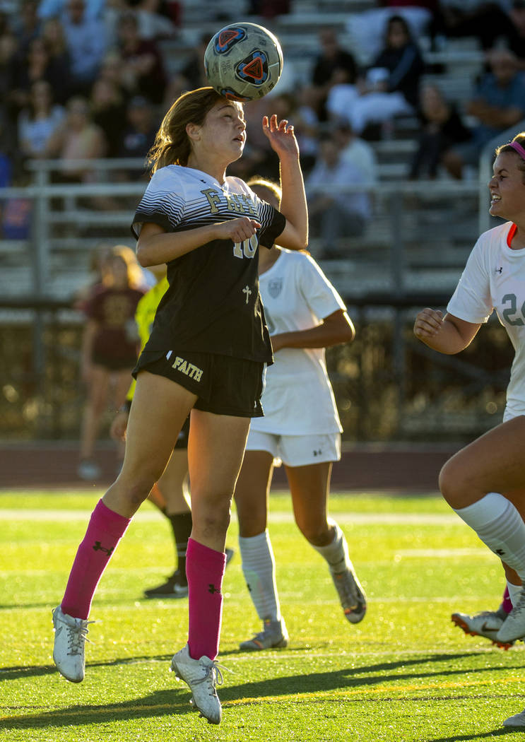 Faith Lutheran’s speed gave Arbor View problems, especially early in the match, and kept the ball in the Aggies’ end of the field. The Crusaders broke through in the 13th minute, when Folk took a pass from Kennedy Lazenby and sent what appeared to be a cross attempt off the far post and into the goal.