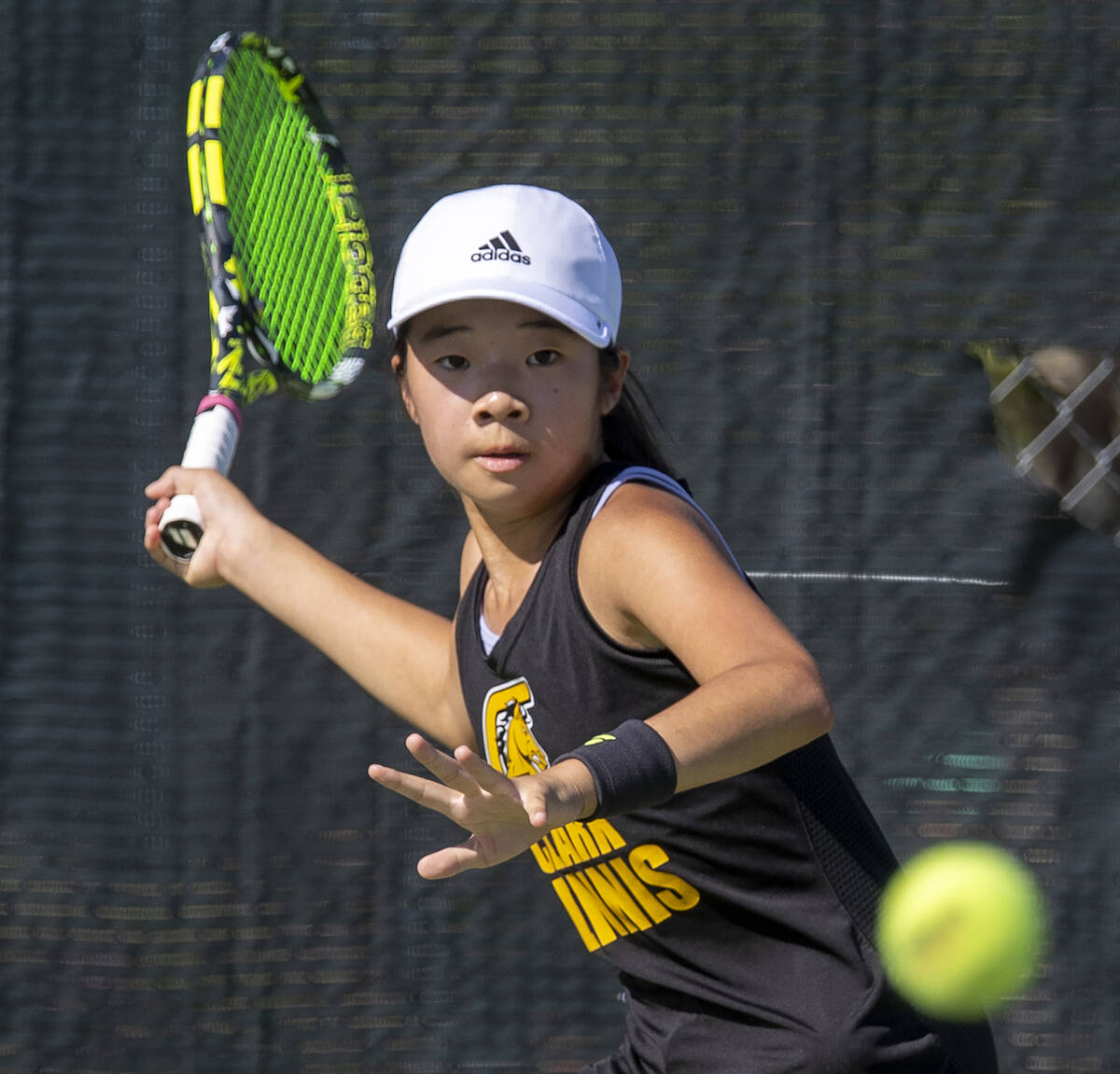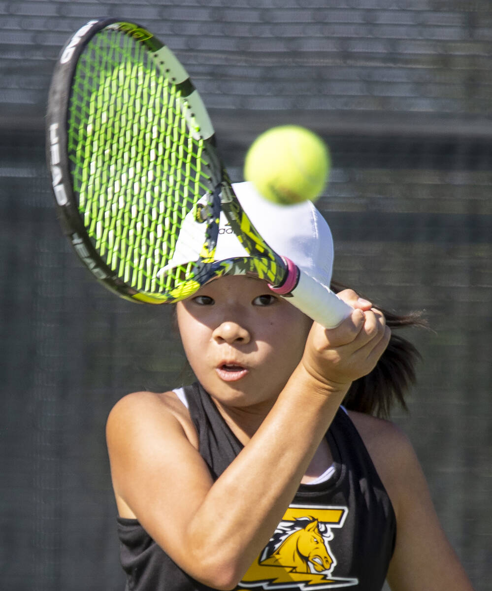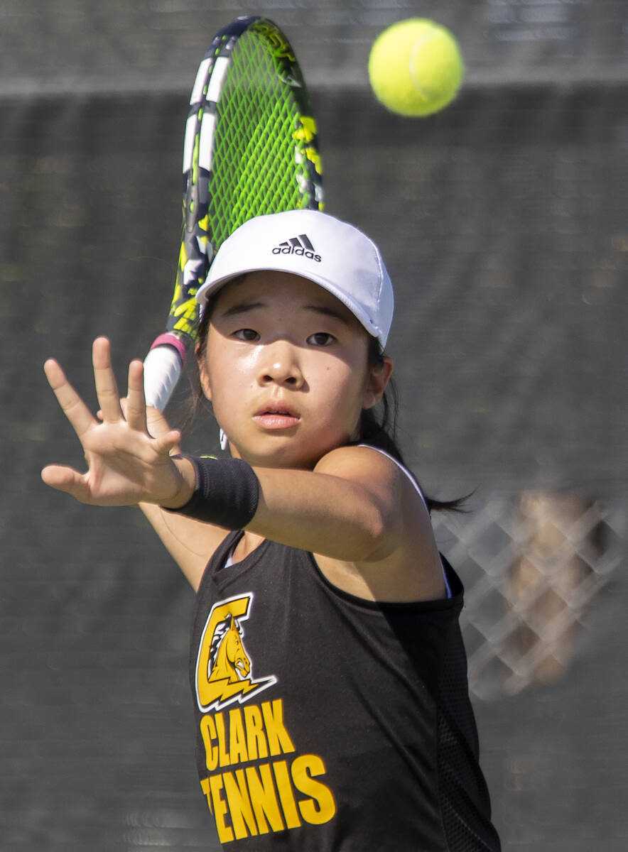 Clark freshman Jane Lee competes during the high school tennis matches against Palo Verde at Palo Verde High School, Wednesday, Sept. 4, 2024, in Las Vegas. (Daniel Jacobi II/Las Vegas Review-Journal)