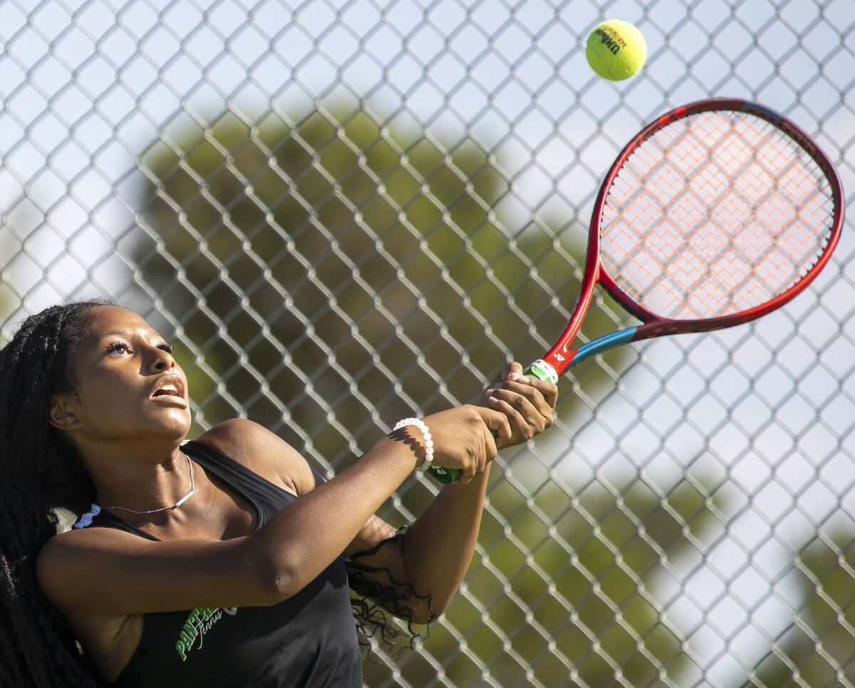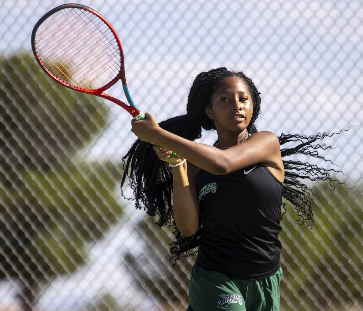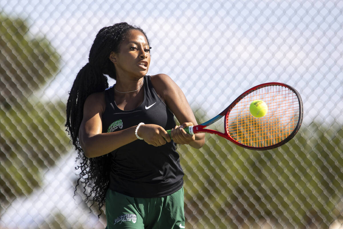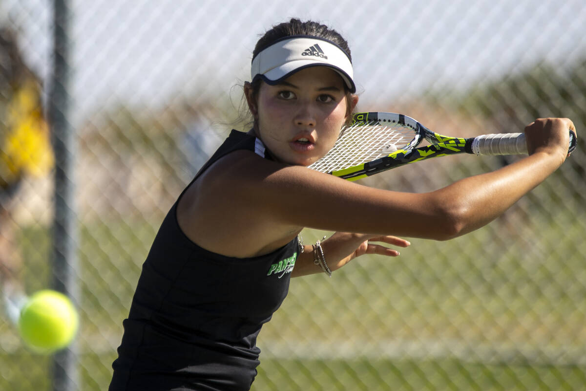 Palo Verde’s Remi Rice competes during the high school tennis matches against Clark at Palo Verde High School, Wednesday, Sept. 4, 2024, in Las Vegas. (Daniel Jacobi II/Las Vegas Review-Journal)