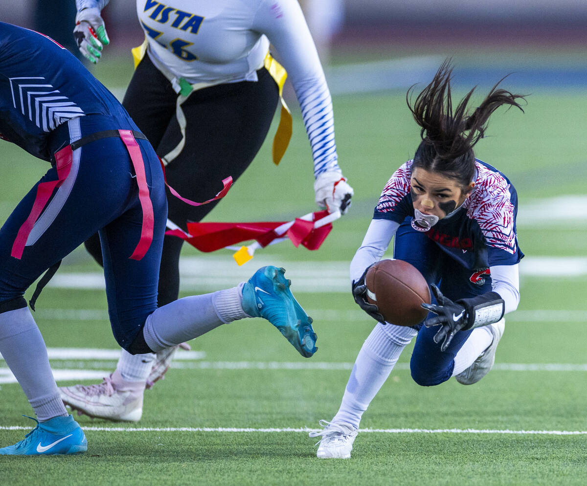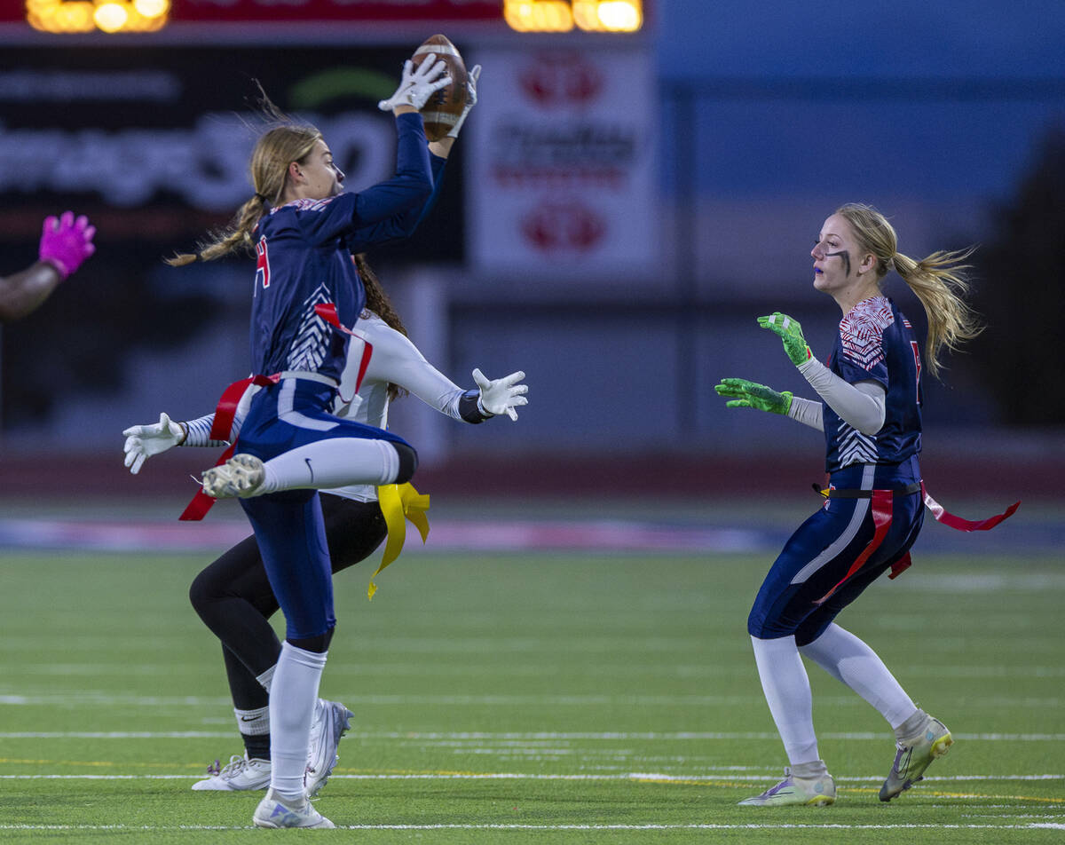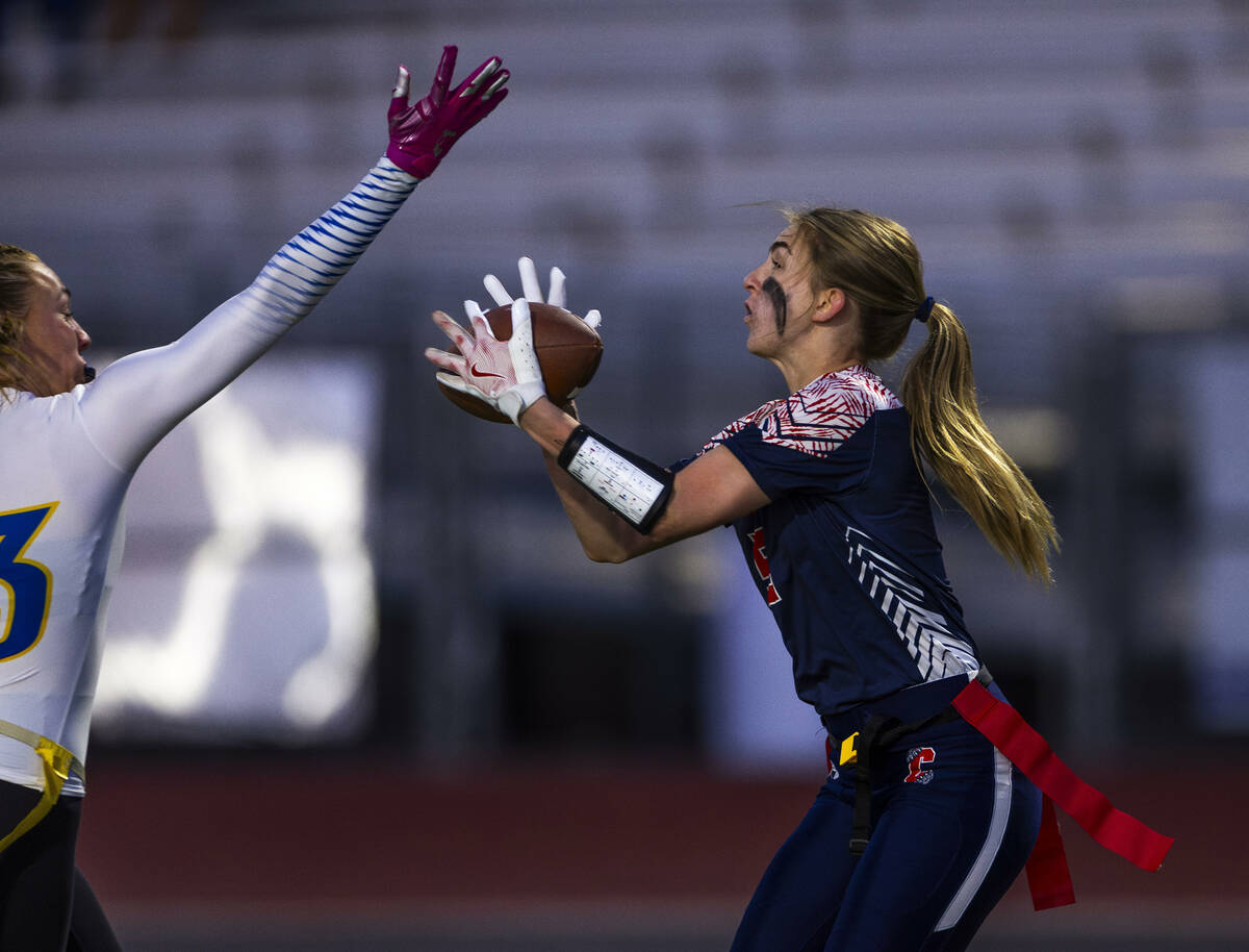 Coronado defensive back Lauren Wood (14) secures an interception over a Sierra Vista receiver during the second half of their Class 4A flag football state quarterfinals game at Coronado High School on Wednesday, Feb. 12, 2025 in Henderson (L.E. Baskow/Las Vegas Review-Journal) @Left_Eye_Images