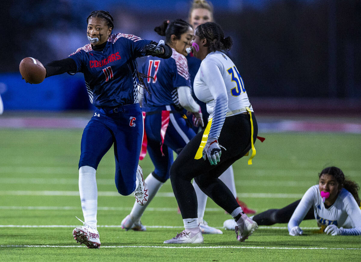 Coronado Jiselle Dudley runner Jiselle Dudley (11) extends for more yards against Sierra Vista defender Amani Rahman (36) during the second half of their Class 4A flag football state quarterfinals game at Coronado High School on Wednesday, Feb. 12, 2025 in Henderson (L.E. Baskow/Las Vegas Review-Journal) @Left_Eye_Images