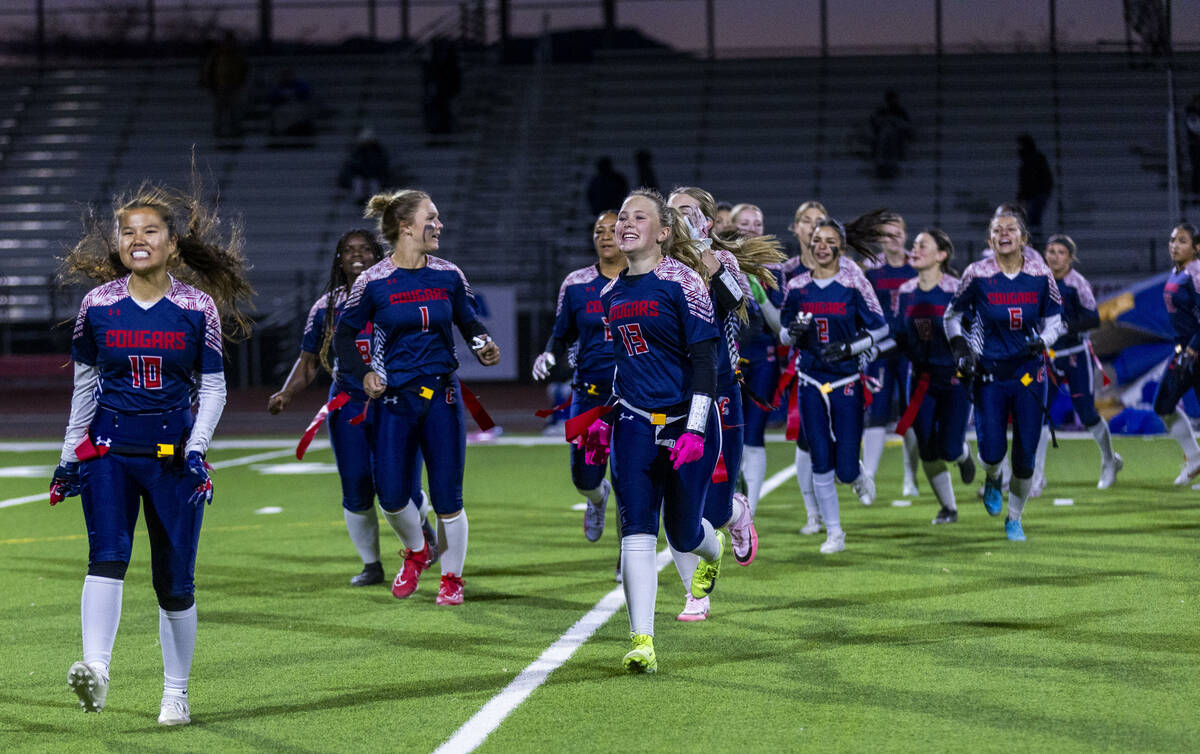 Coronado players celebrate their victory coming off the field against Sierra Vista in their Class 4A flag football state quarterfinals game at Coronado High School on Wednesday, Feb. 12, 2025 in Henderson (L.E. Baskow/Las Vegas Review-Journal) @Left_Eye_Images