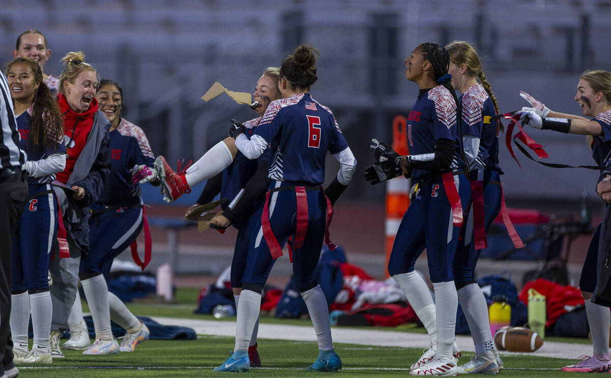 Sierra Vista players celebrate their first score over Coronado during the first half of their Class 4A flag football state quarterfinals game at Coronado High School on Wednesday, Feb. 12, 2025 in Henderson (L.E. Baskow/Las Vegas Review-Journal) @Left_Eye_Images